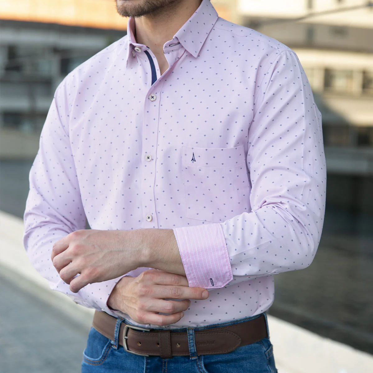 Camisa Custom Manga Larga Gris Claro con Microdibujo Kosta Azul