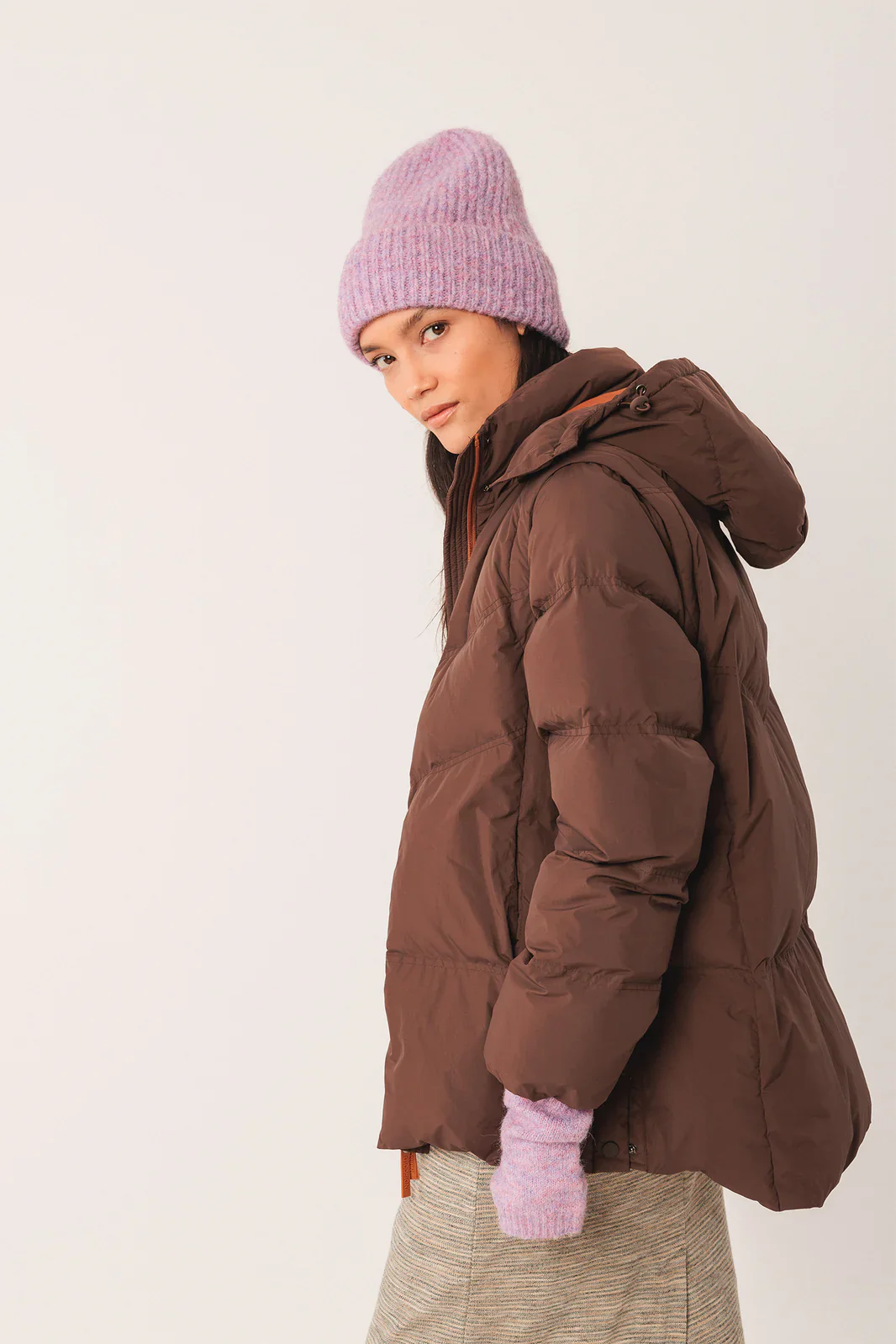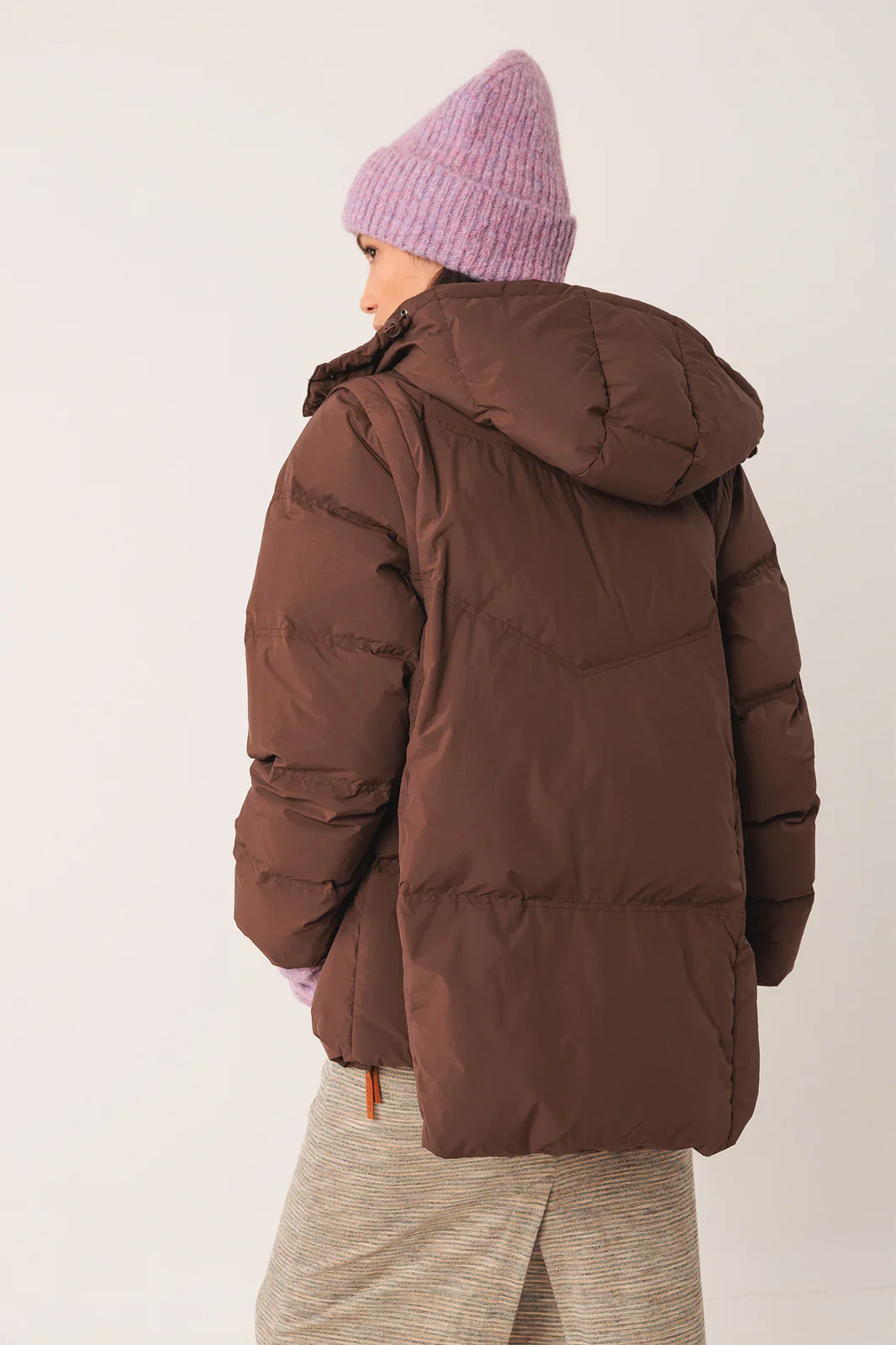 • Cuello subido y hombro encajado con manga extraíble