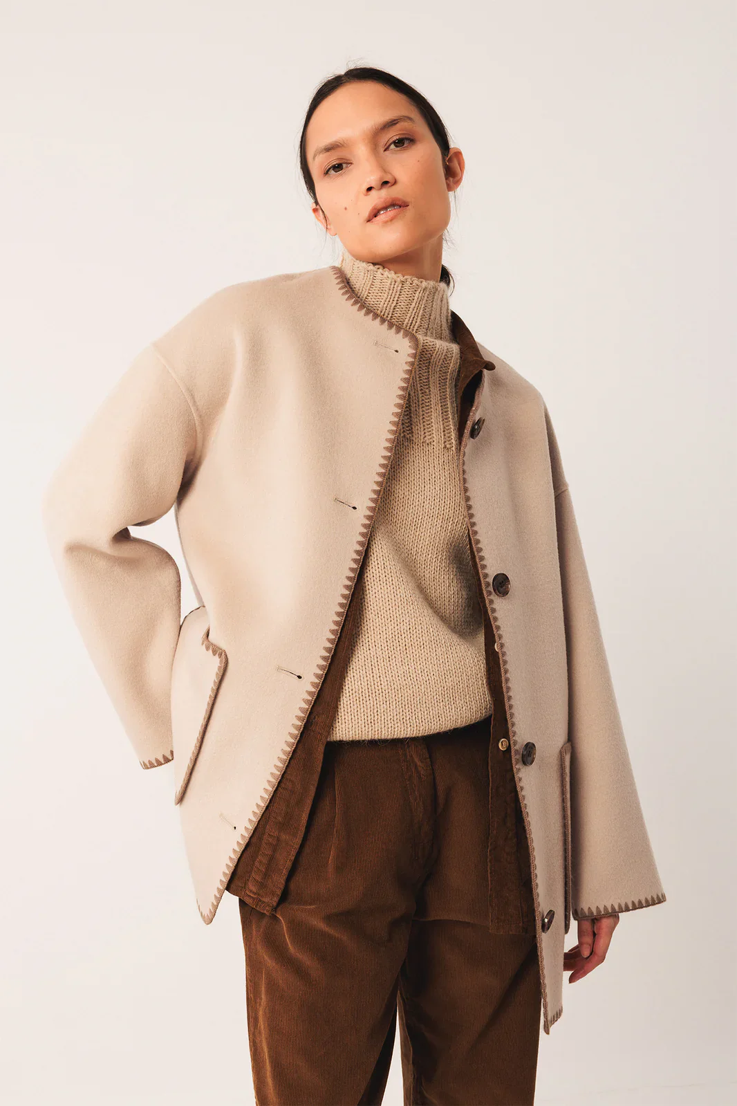 Si te gustan los pequeños detalles, este abrigo de lana con bufanda incorporada y extraíble está hecha para ti. Todos los acabados de esta prenda están bordados manualmente y su fit regular sienta genial.