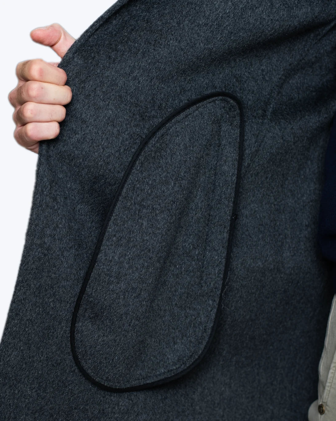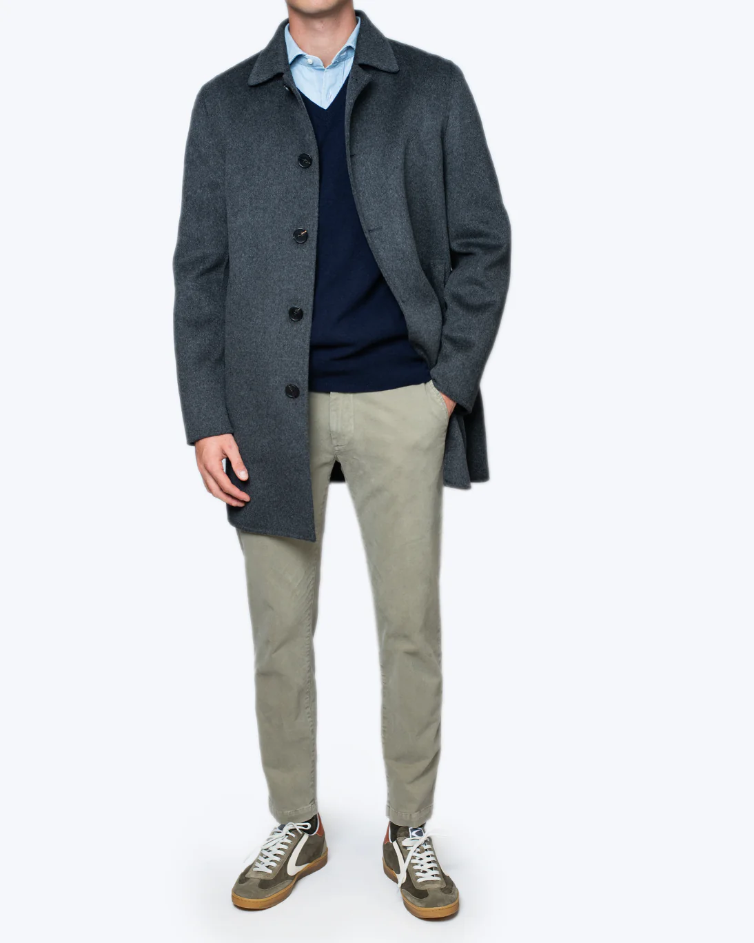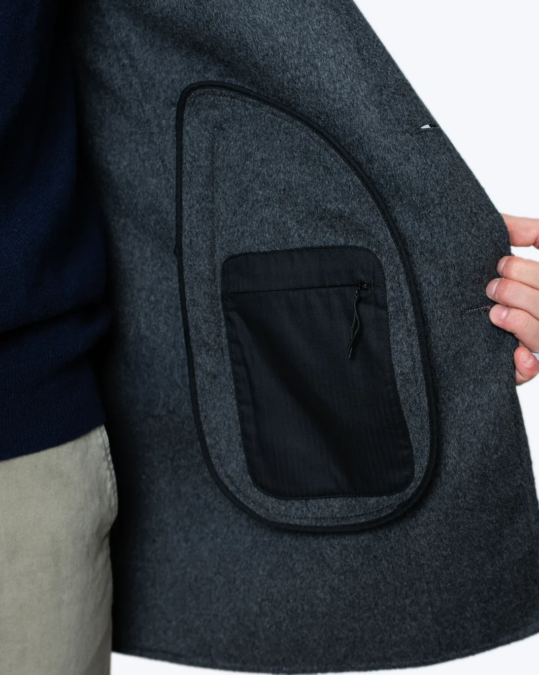 Dispone de un cierre frontal de cuatro botones y dos bolsillos delanteros. En el interior, cuenta con un bolsillo adicional, con cremallera, perfecto para guardar objetos de valor. Las mangas cuentan con un forro interior aportando a la prenda mayor comodidad y terminan en puños limpios sin botón.