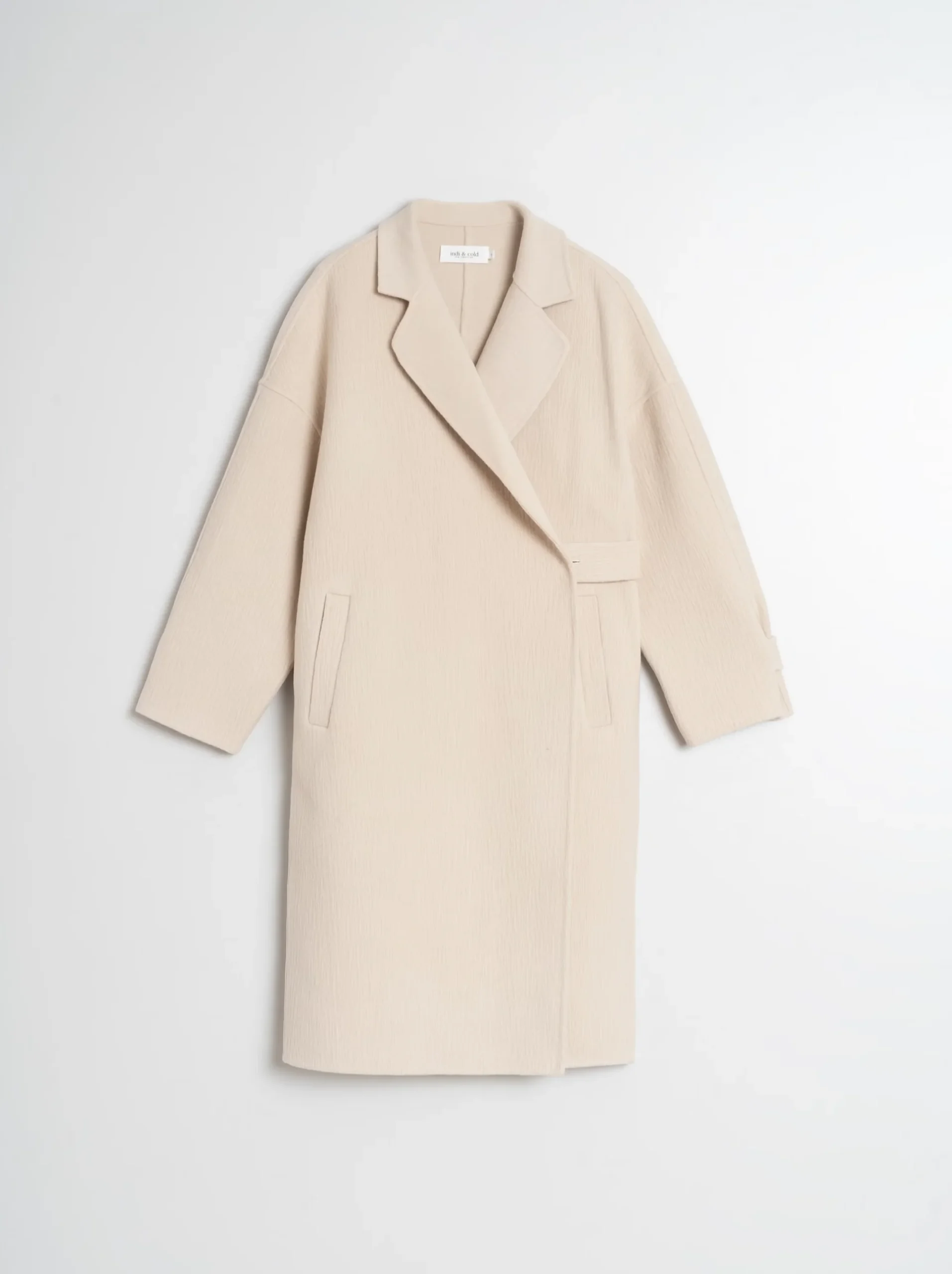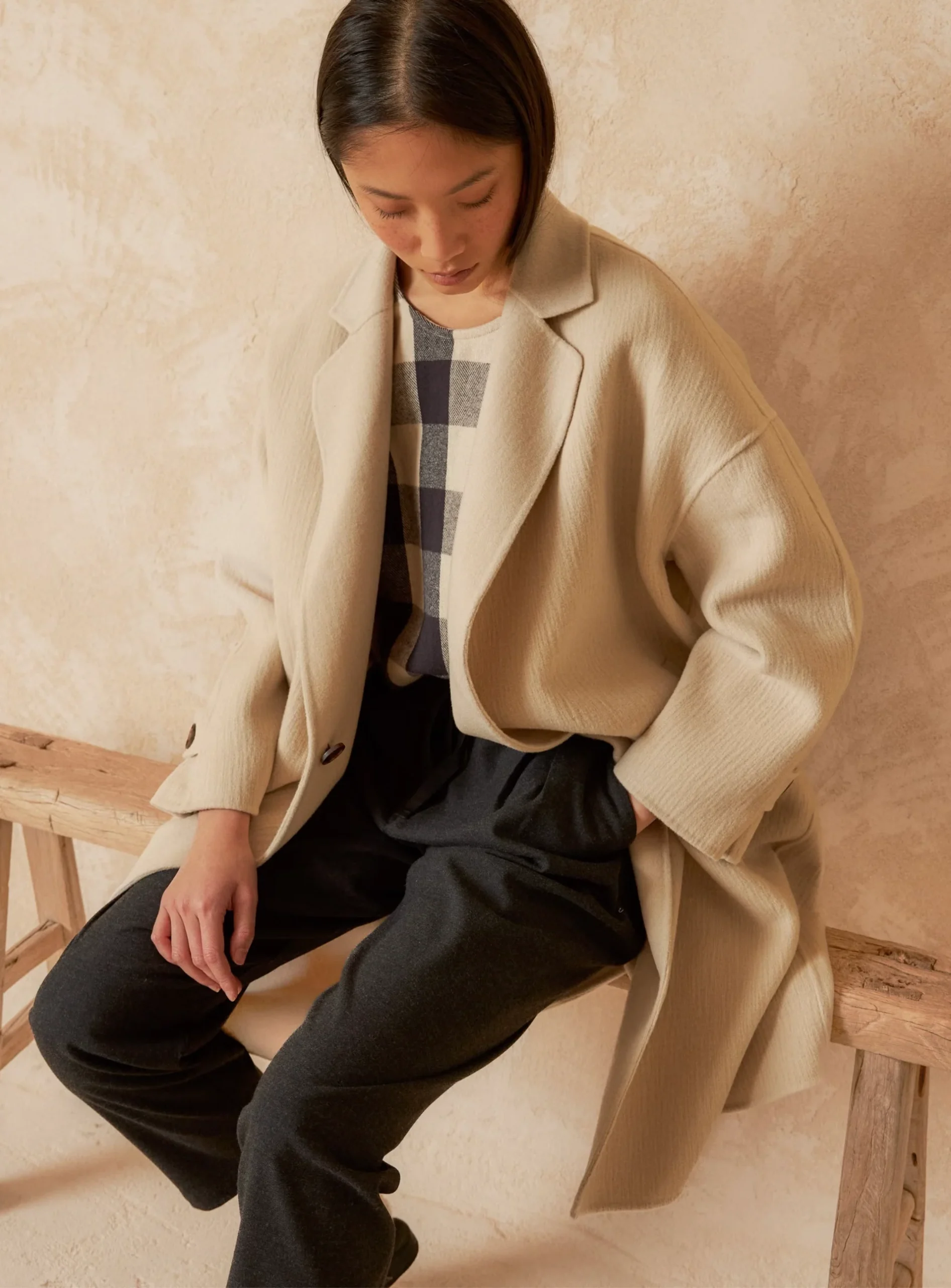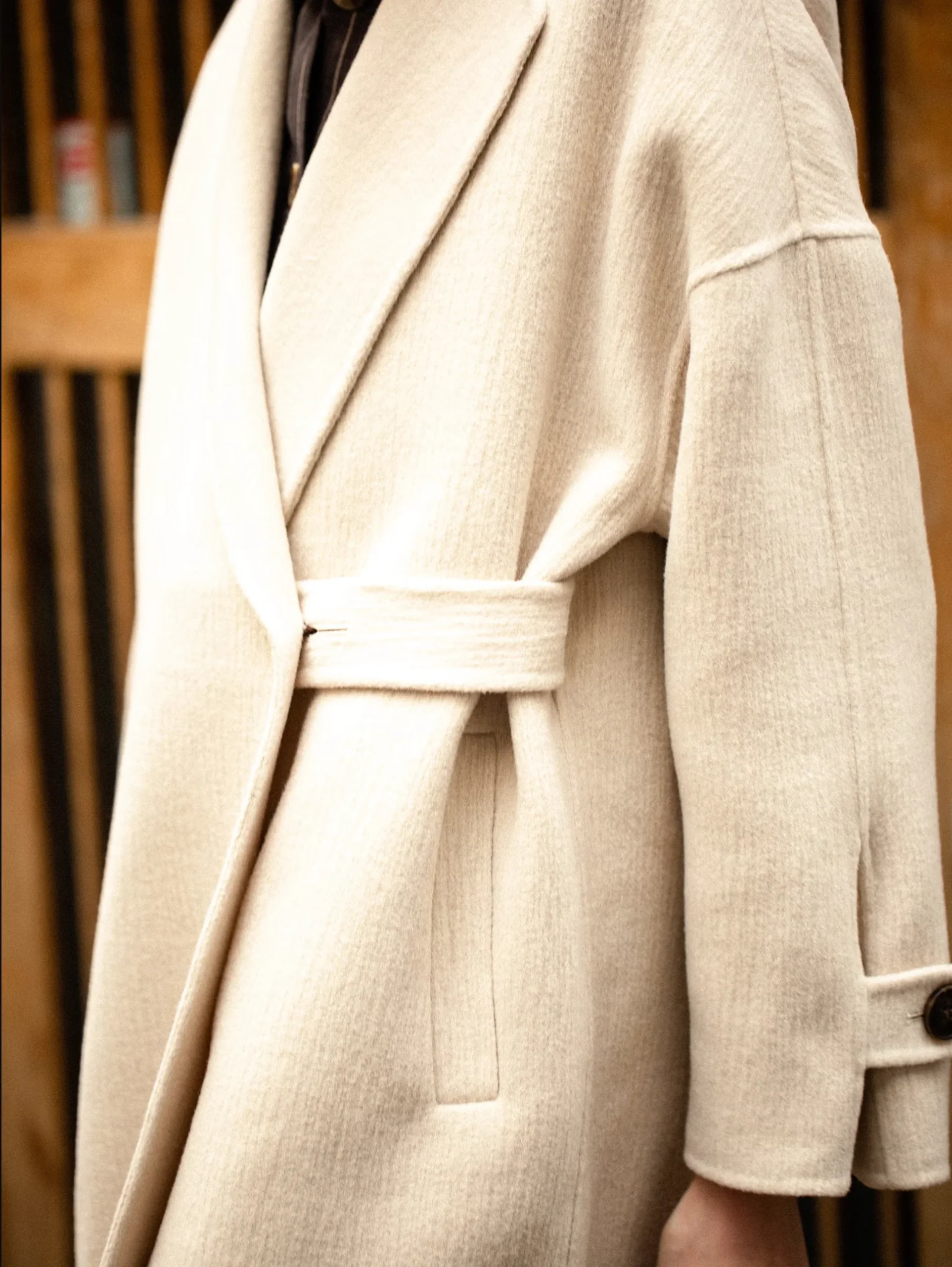 Un abrigo clásico pero renovado, de estilo japonés con cierre cruzado que se ata por dentro con lazada y botón, y un corte amplio que lo hace diferente a otros. Confeccionado en lana, tiene una textura distintiva.