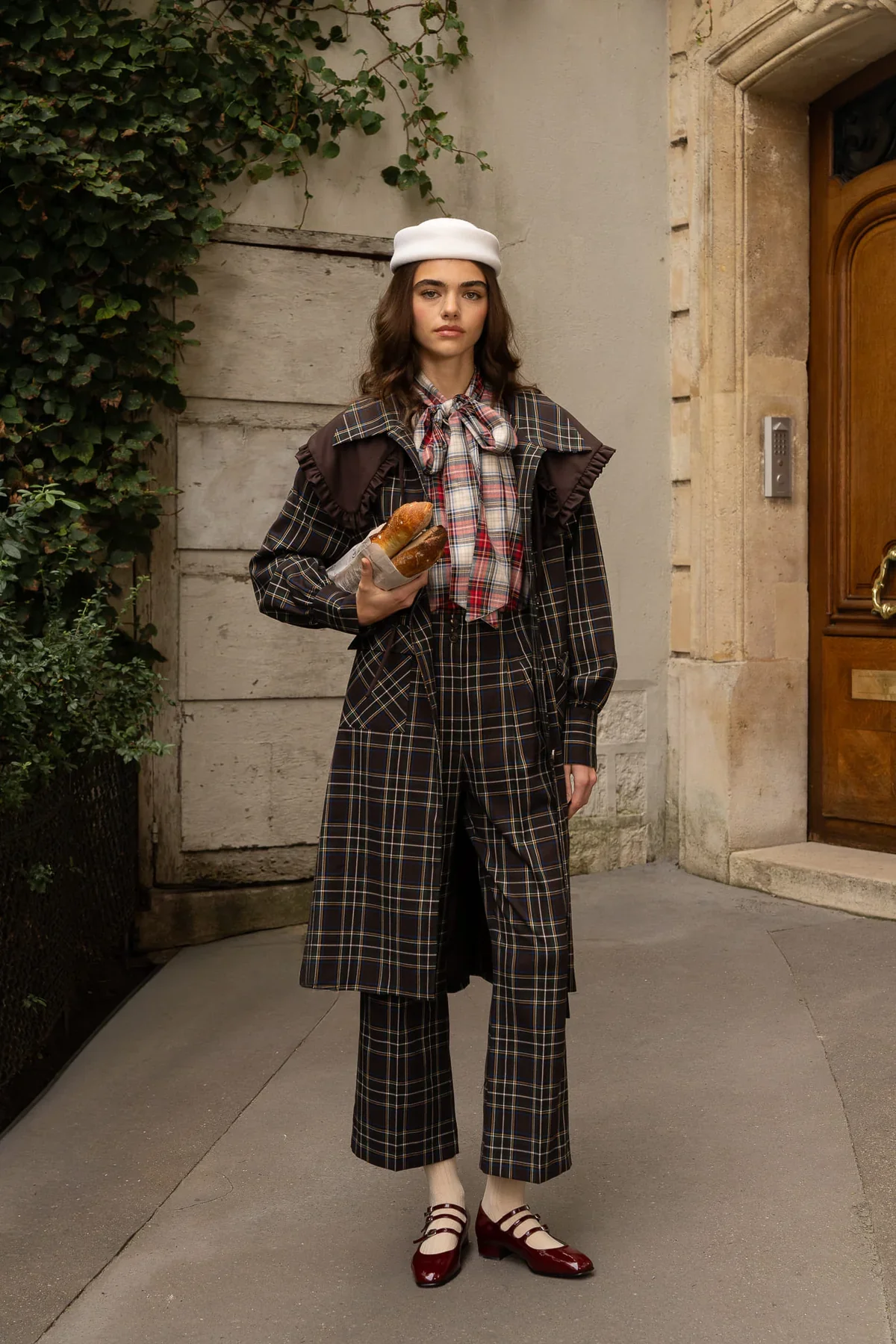 El Abrigo Nikita es una pieza icónica que combina sofisticación parisina y estilo contemporáneo. Confeccionado en una exquisita tela de cuadro escocés en tonos oscuros, este abrigo largo destaca por su corte estructurado, sus volantes decorativos en los hombros y su caída fluida, que aportan un aire femenino y distintivo.