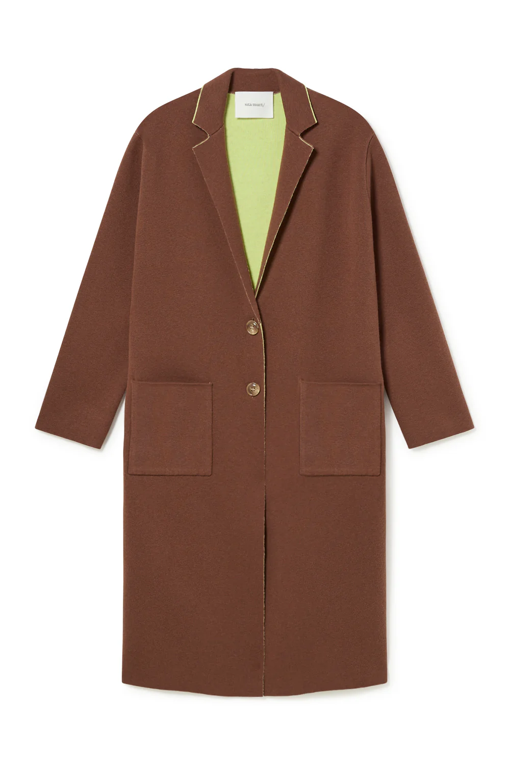 Abrigo oversize de punto compacto y reversible, que se abrocha con botones. La parte interior tiene las costuras vistas contrastadas. Este punto reversible se consigue con una técnica innovadora que une las dos caras con un monofilamento muy delgado de poliamida. La galga del punto es 12.
