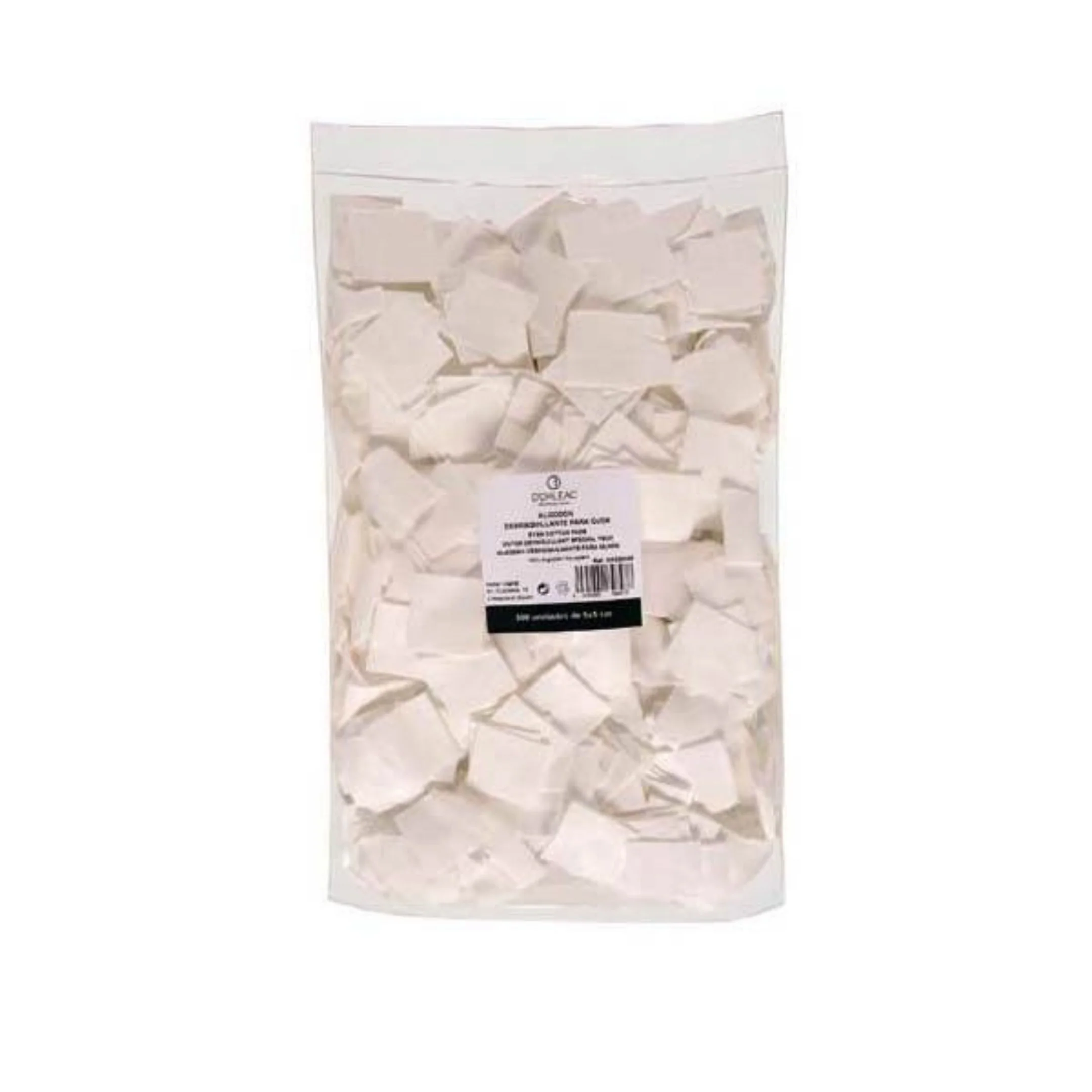 Algodón desmaquillante para ojos bolsa de 500 unidades en cuadraditos 100% algodón, presentados en una bolsa que contiene 500 unidades. Presentados en cuadrados de 5x5cm y se pueden usar por ambas caras para poder eliminar de forma más eficaz el maquillaje.