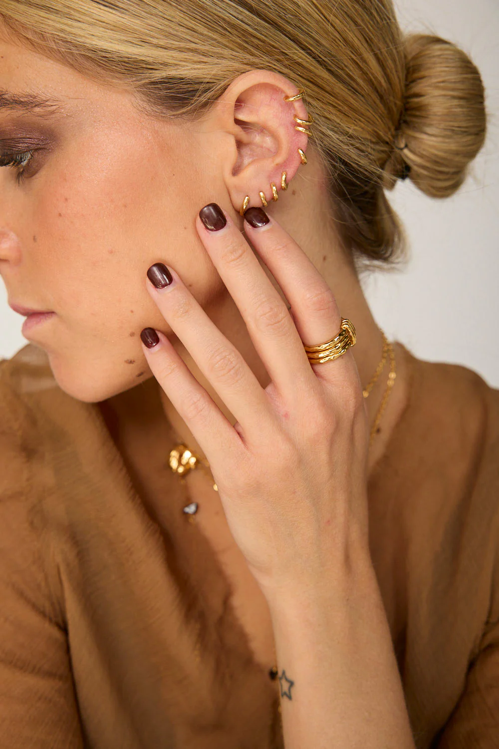 La superficie martillada de cada aro añade un toque artesanal, evocando la belleza rústica y atemporal de los paisajes desérticos.