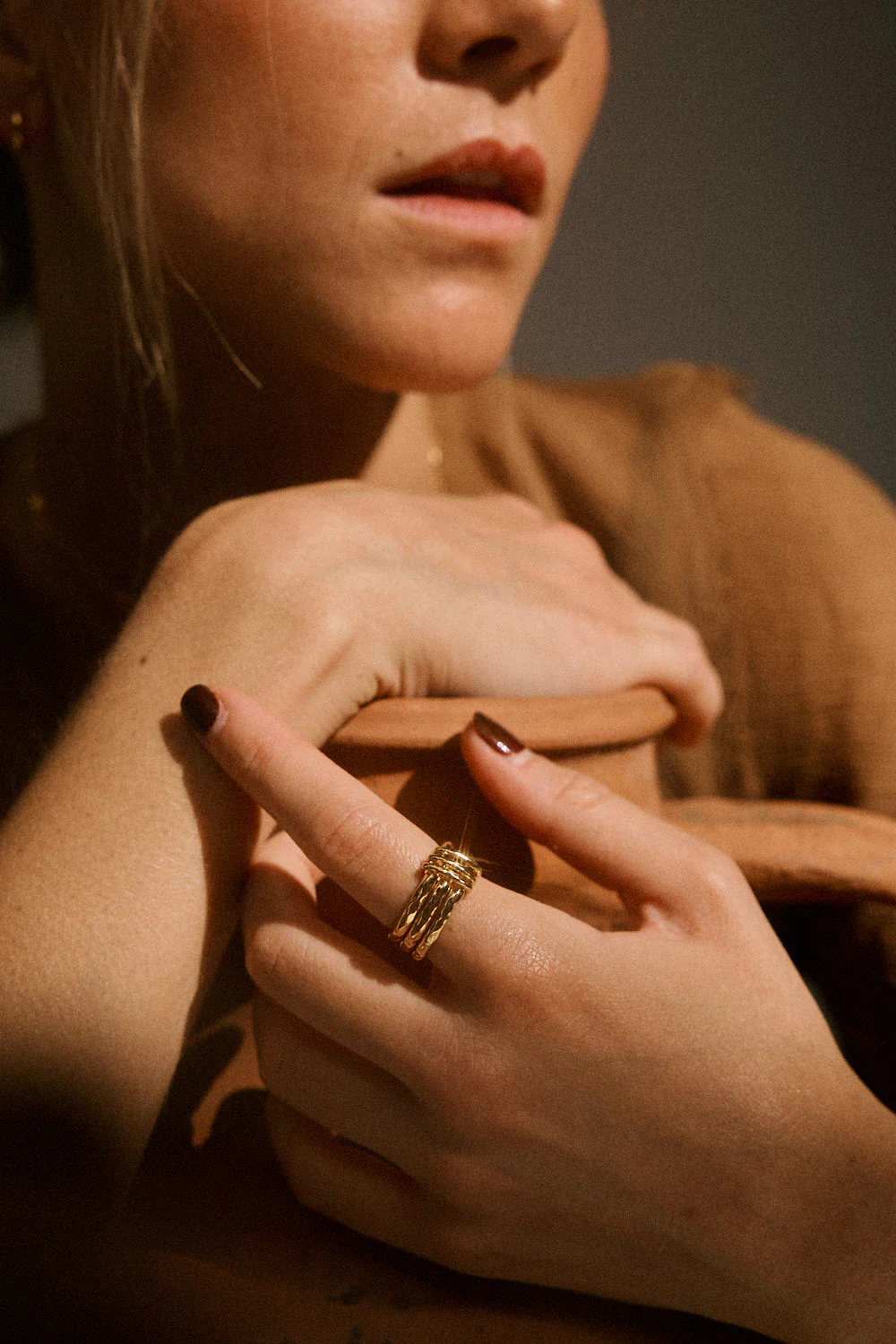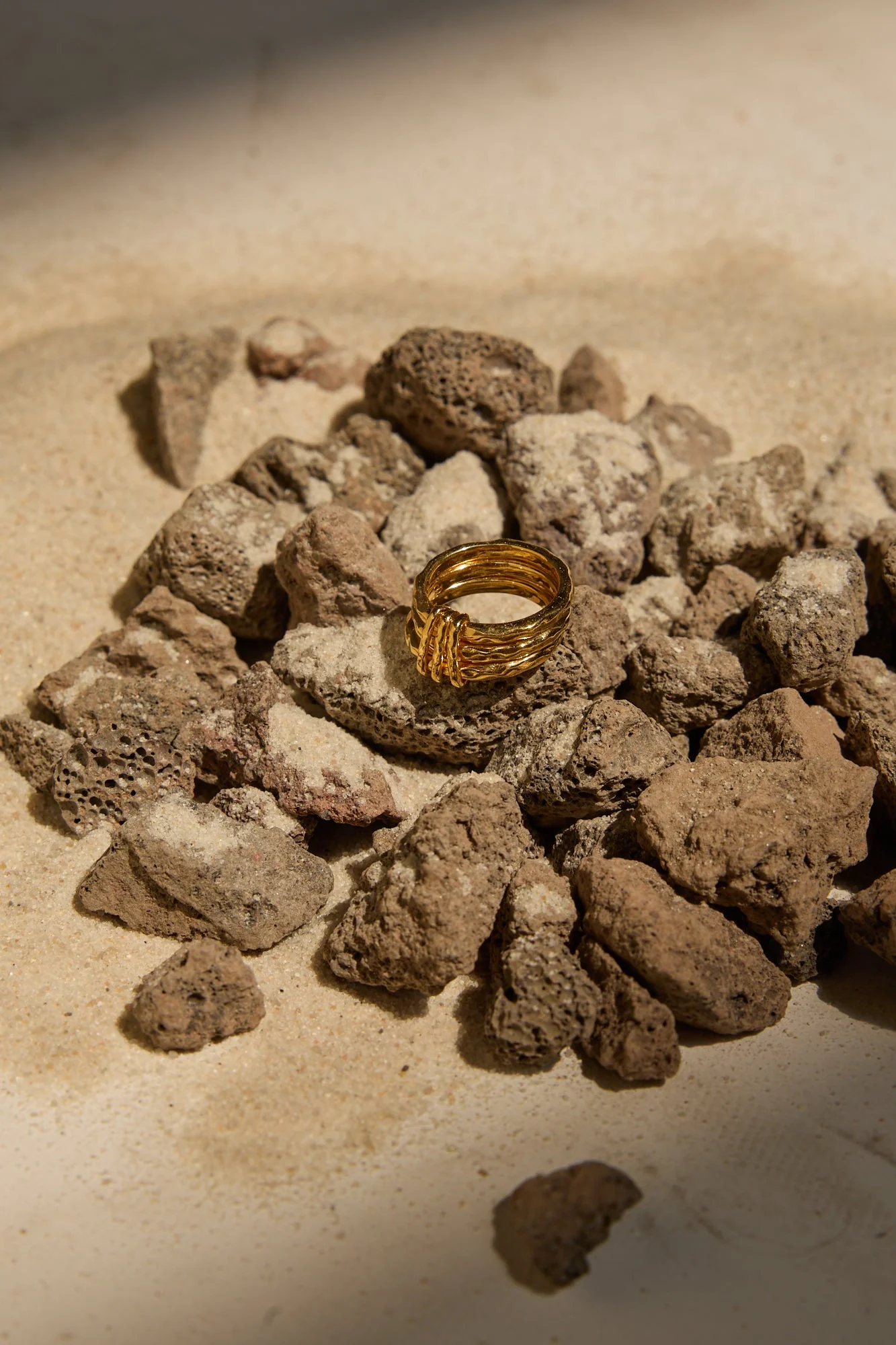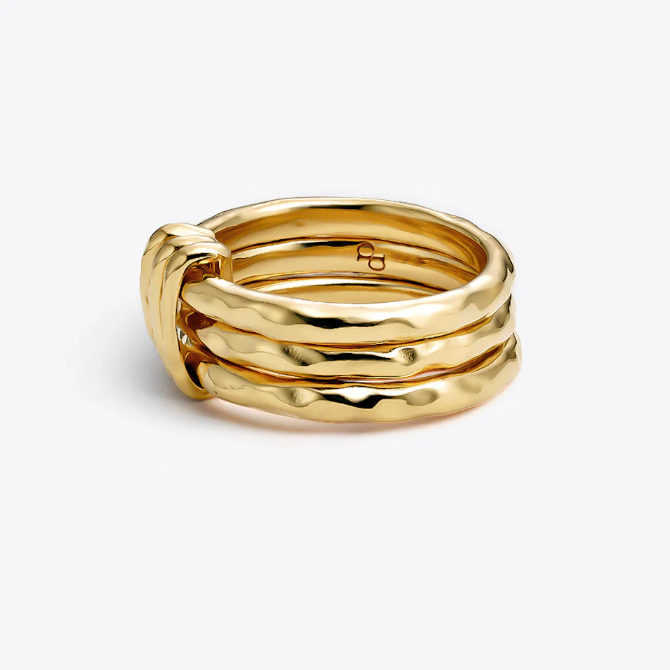Inspirado en las suaves ondulaciones de las dunas bajo el sol, este anillo presenta múltiples aros dorados, cada uno cuidadosamente diseñado para reflejar la textura y el movimiento constante de las arenas.
