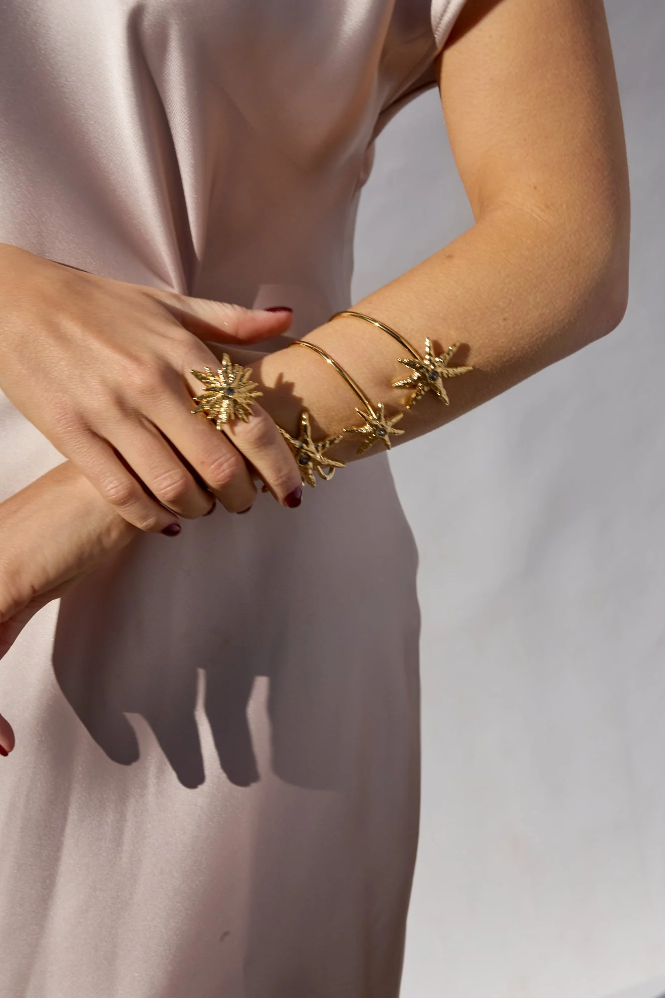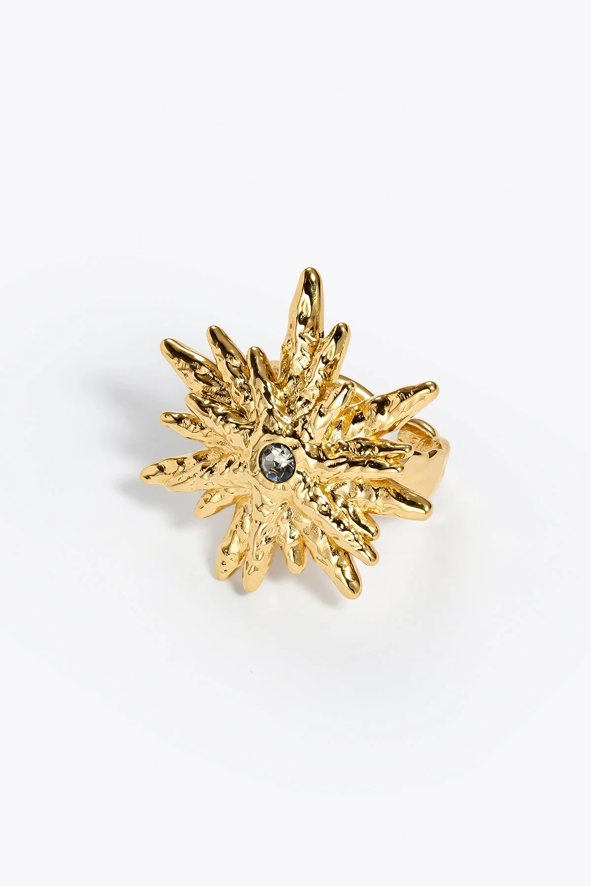 El anillo dorado Astral para mujer de nuestra cápsula de invitada está inspirado en el caos y en la heterogeneidad de la naturaleza y el universo.