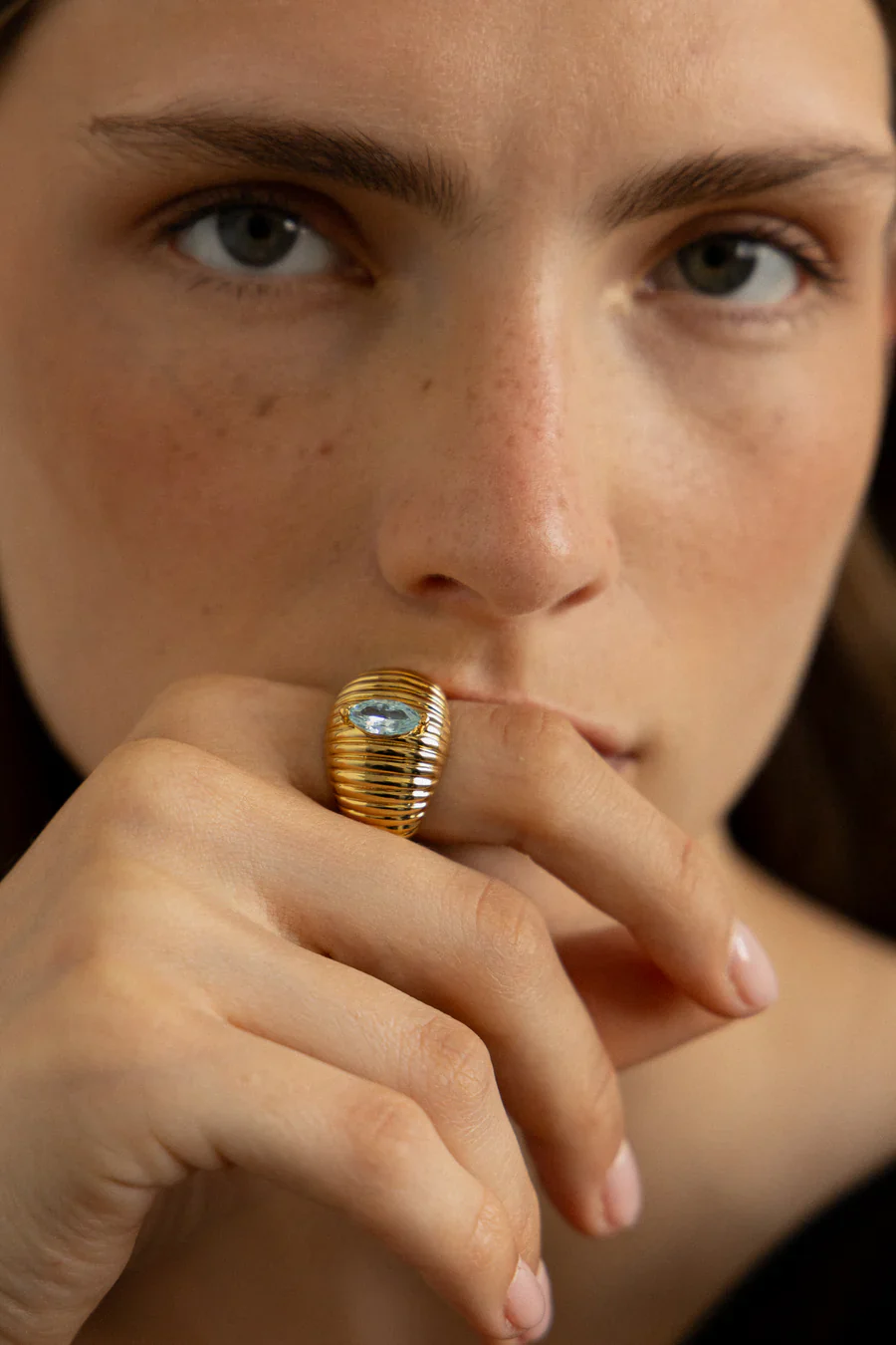 El Anillo Luisa es una pieza con carácter y presencia. Su diseño ancho y pulido se realza con una circonita azul talla marquise en el centro, que aporta un toque sofisticado y moderno. Ideal para quienes buscan una joya llamativa pero elegante, que eleve cualquier look con un solo gesto.