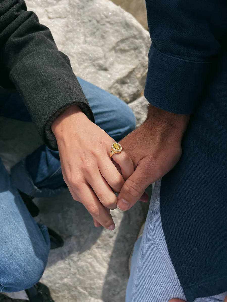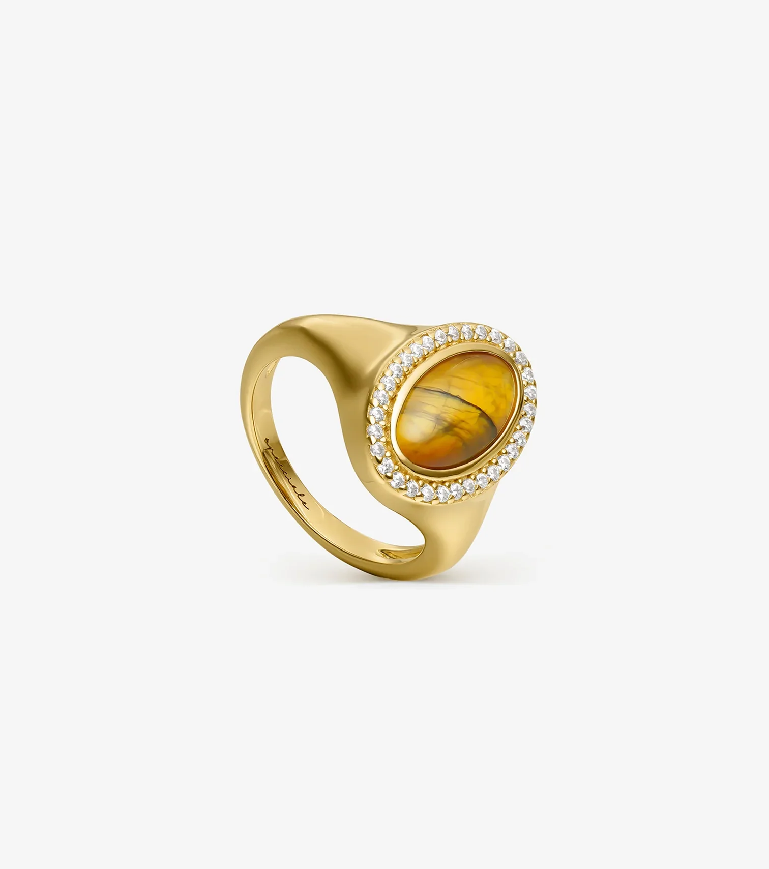Anillo realizado en Plata de Ley chapado en 3 micras en Oro de 18k. Un diseño que tiene como protagonista su piedra central. Disponible en Lapislázuli y Ojo de Tigre, ambas piedras naturales rodeadas de circonitas.