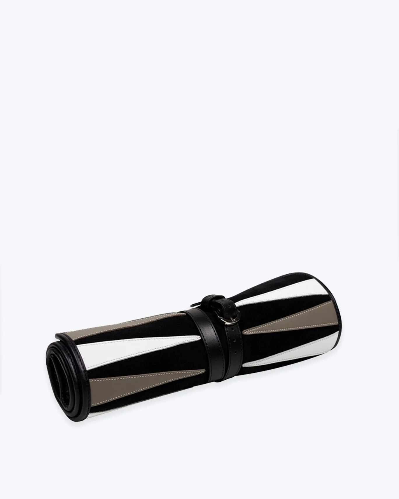 Su interior es de ante y piel lisa. Además, presenta una correa desmontable de cuero liso para sujetar su juego enrollado.