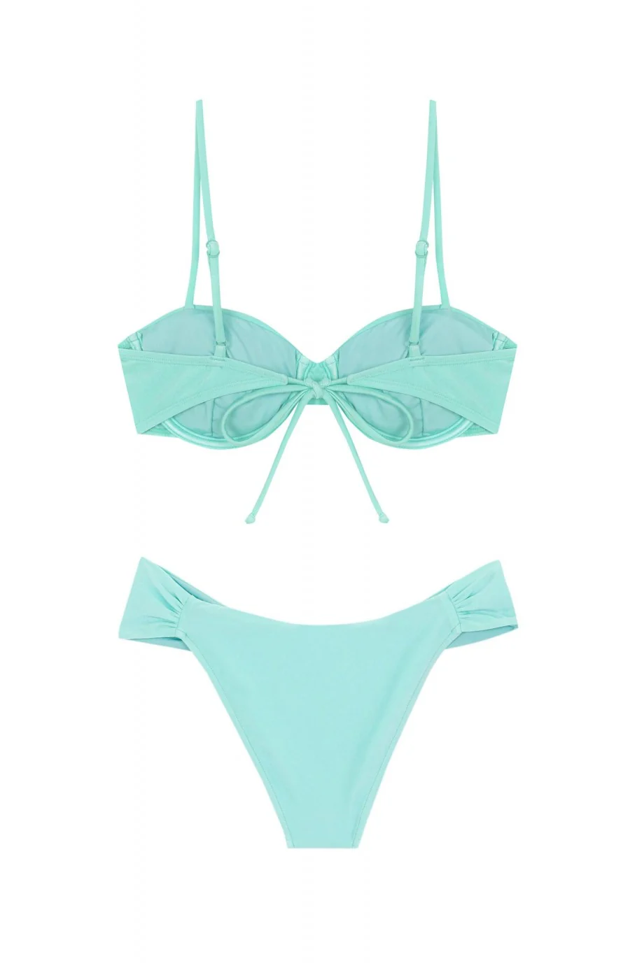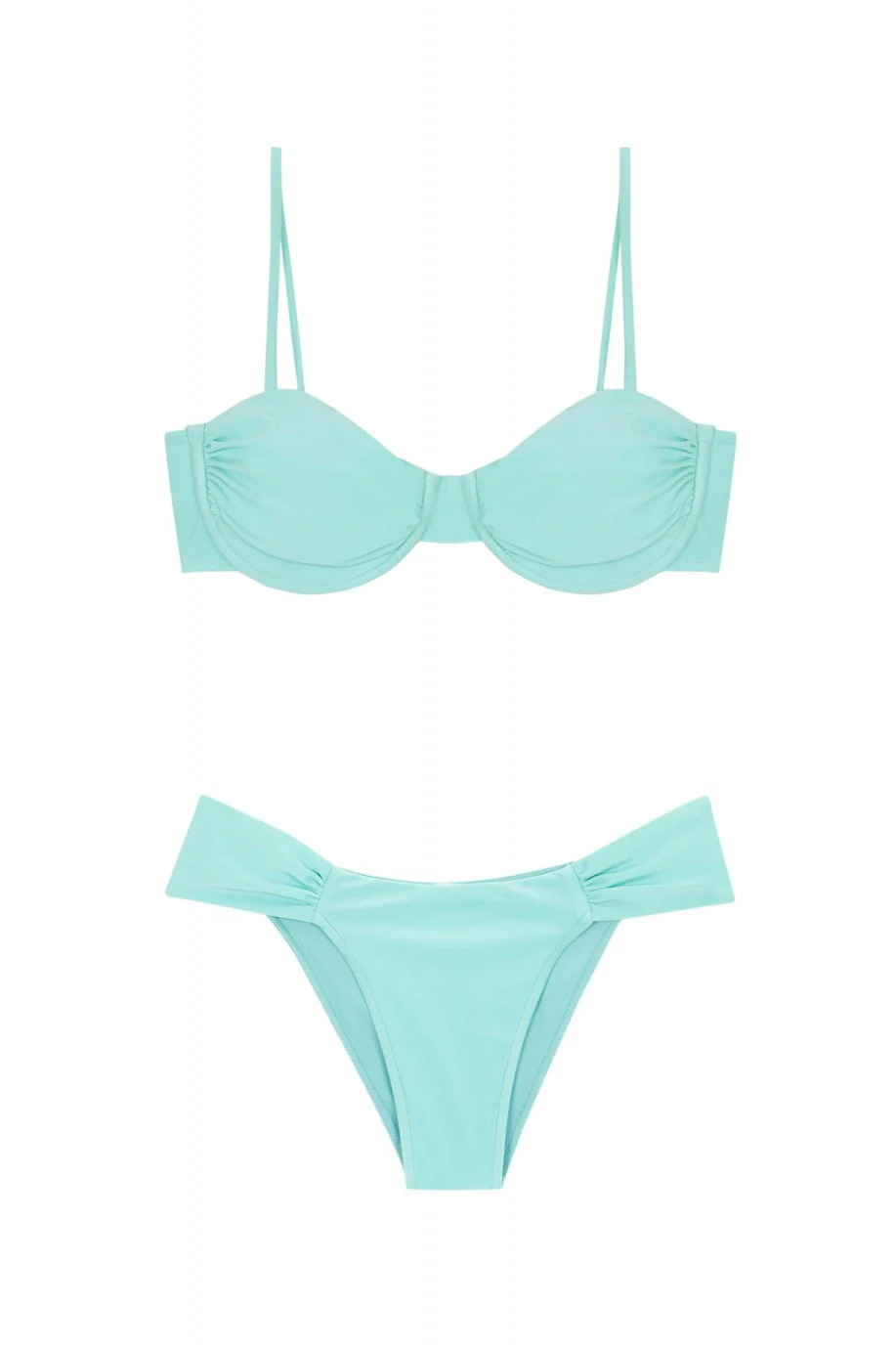 Bikini de forma balconette fruncido en el pecho, de color turquesa ligeramente satinado.