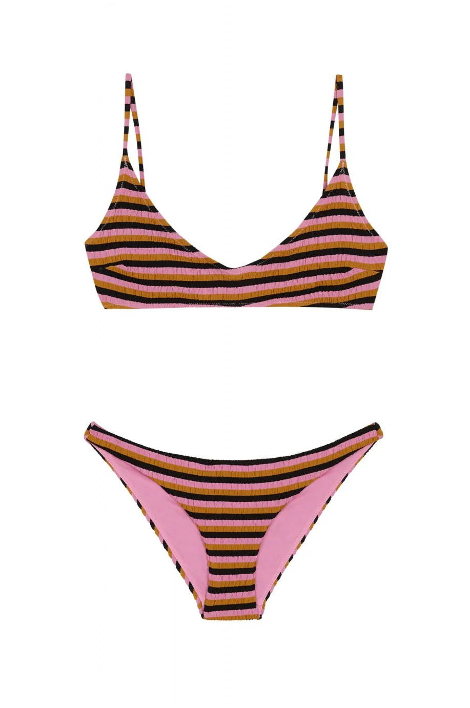 Bikini de estilo deportivo con rayas multicolor en forma de espiga, con tejido en estructura encanillada.