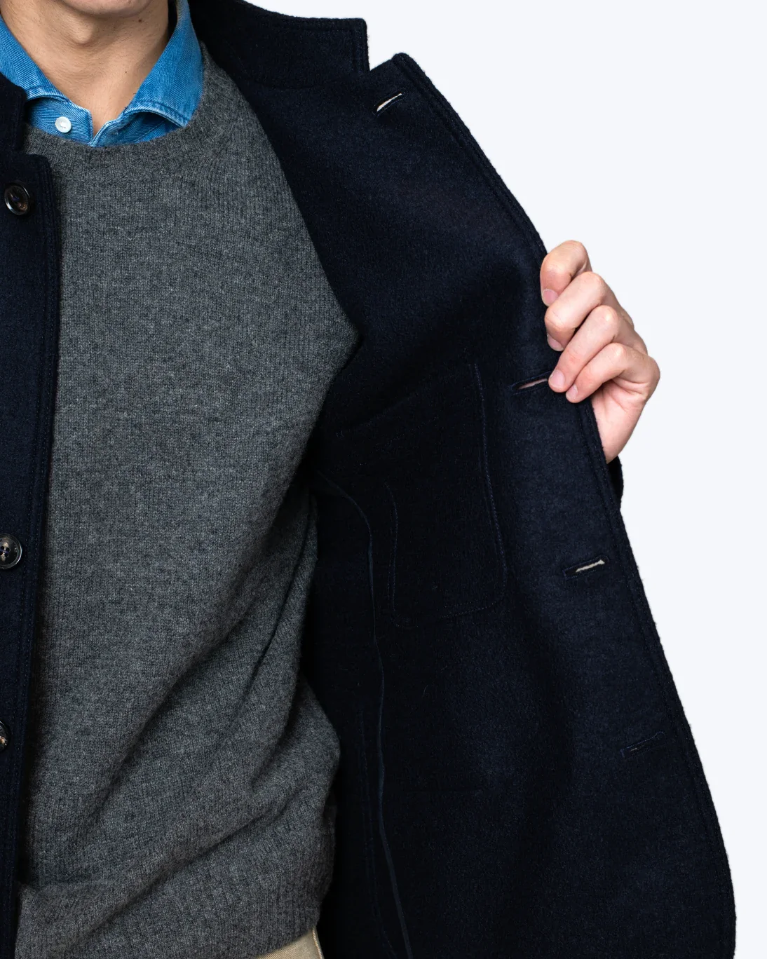 Las mangas están forradas y acabadas en puños limpios sin botón.