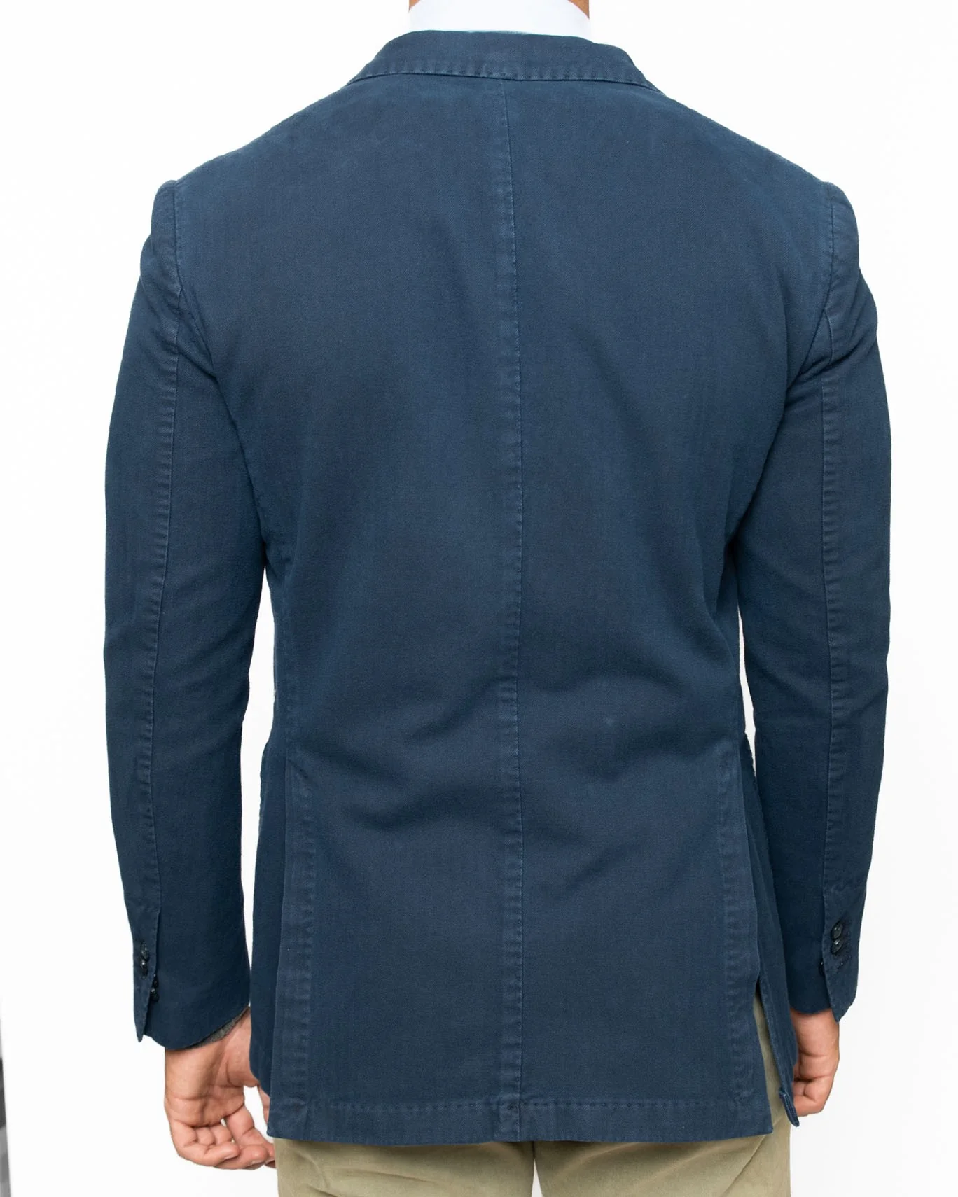En la parte trasera, tiene dos aberturas. Mientras que las mangas están forradas y rematadas con un puño de cuatro botones.