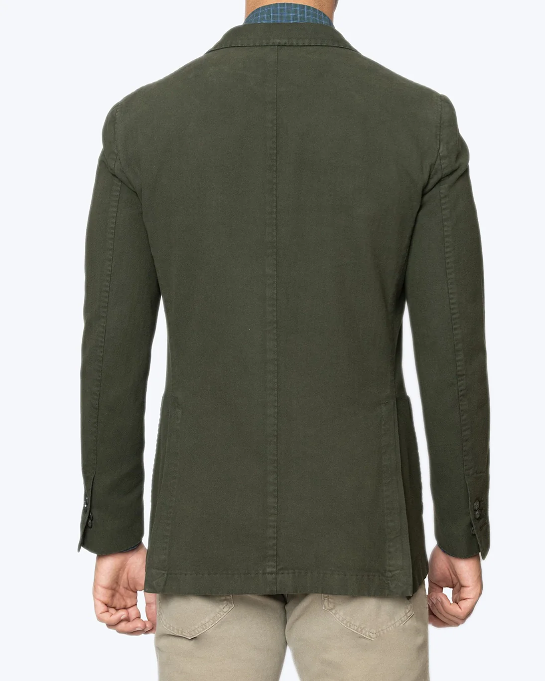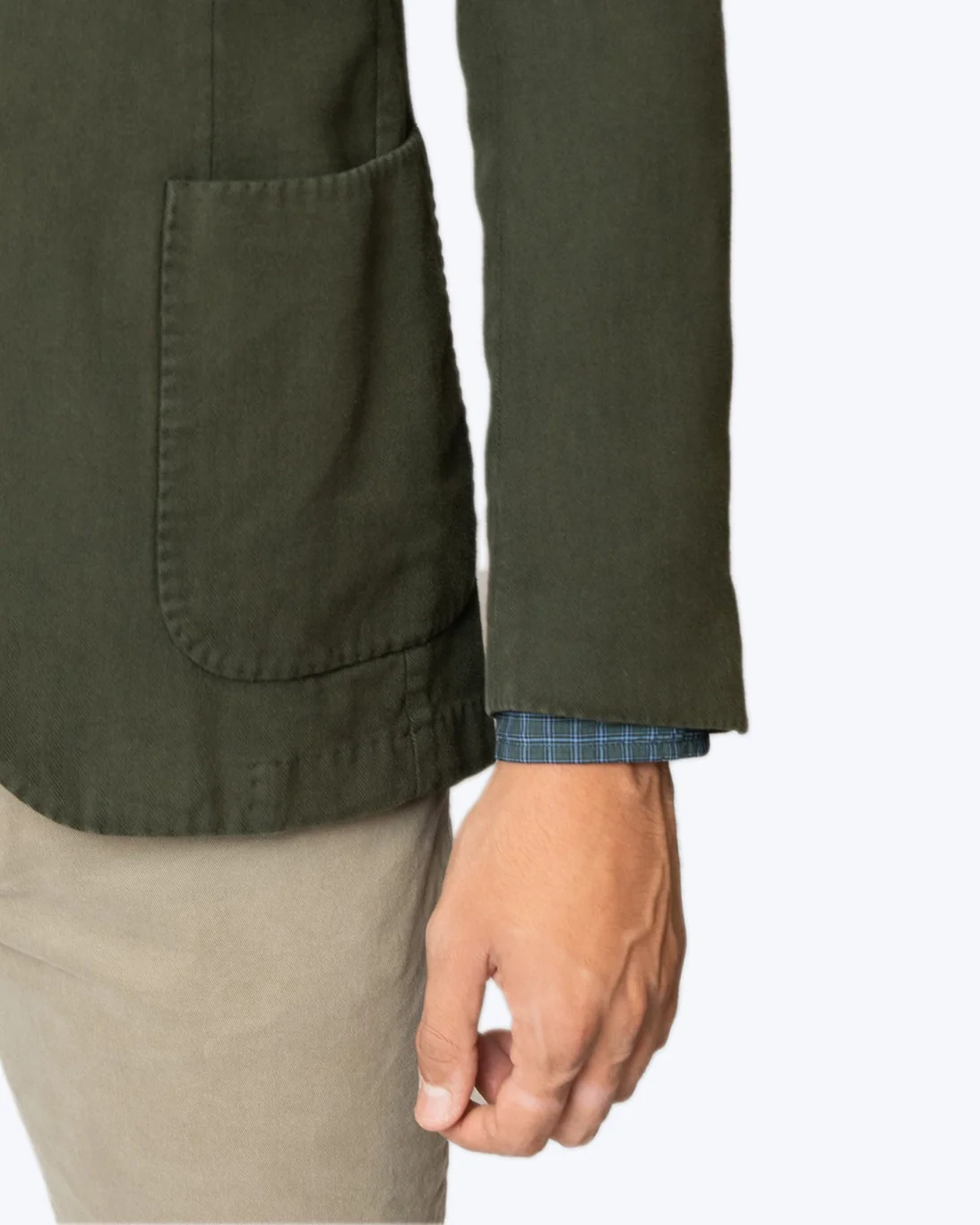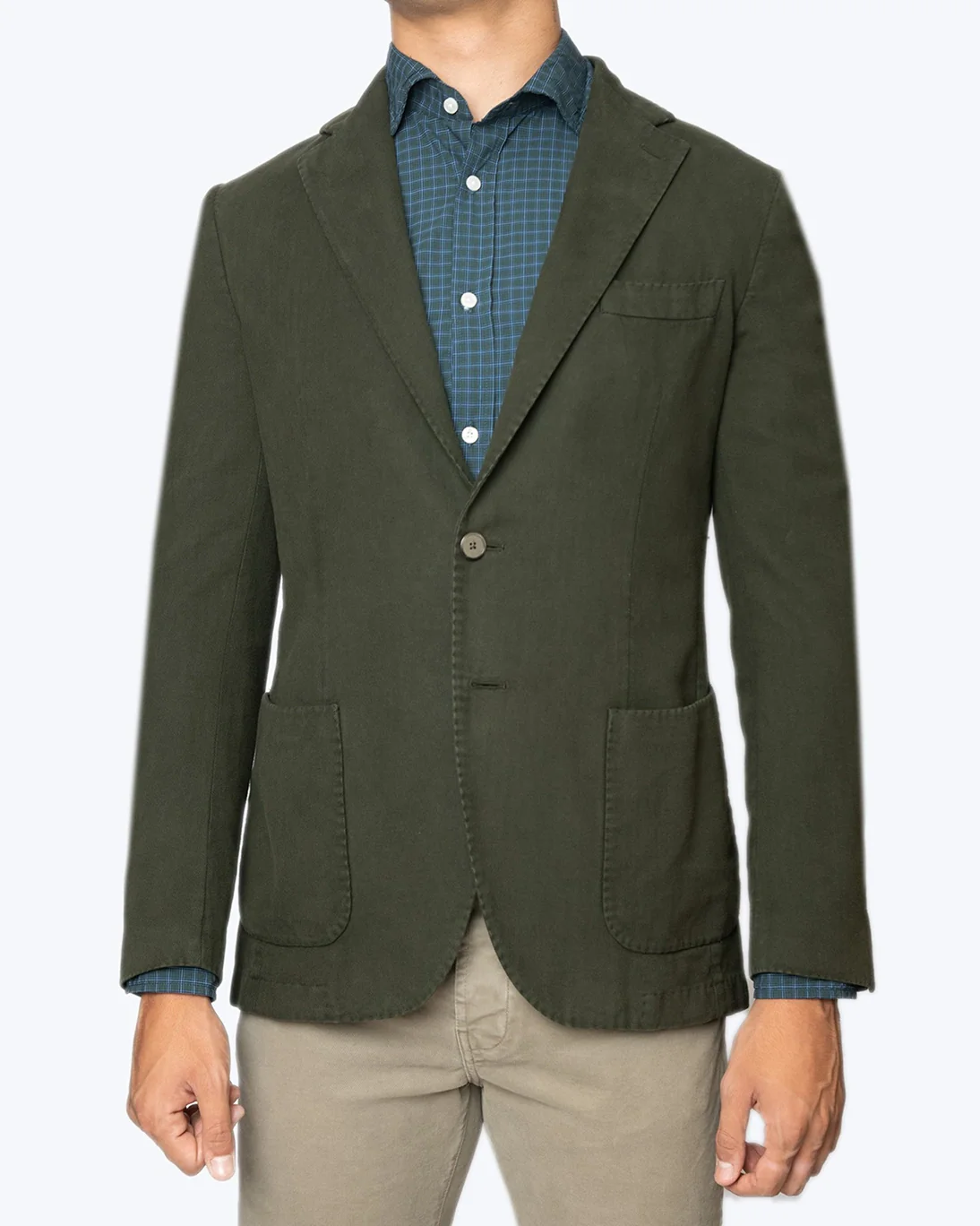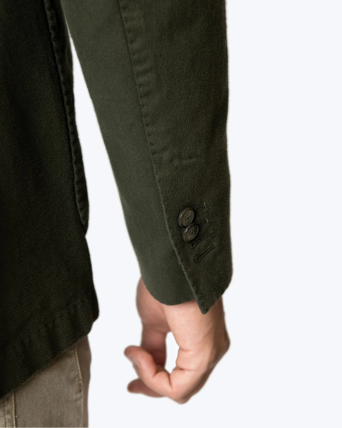 Presenta bolsillos frontales bajos y cierre de botones en el puño.