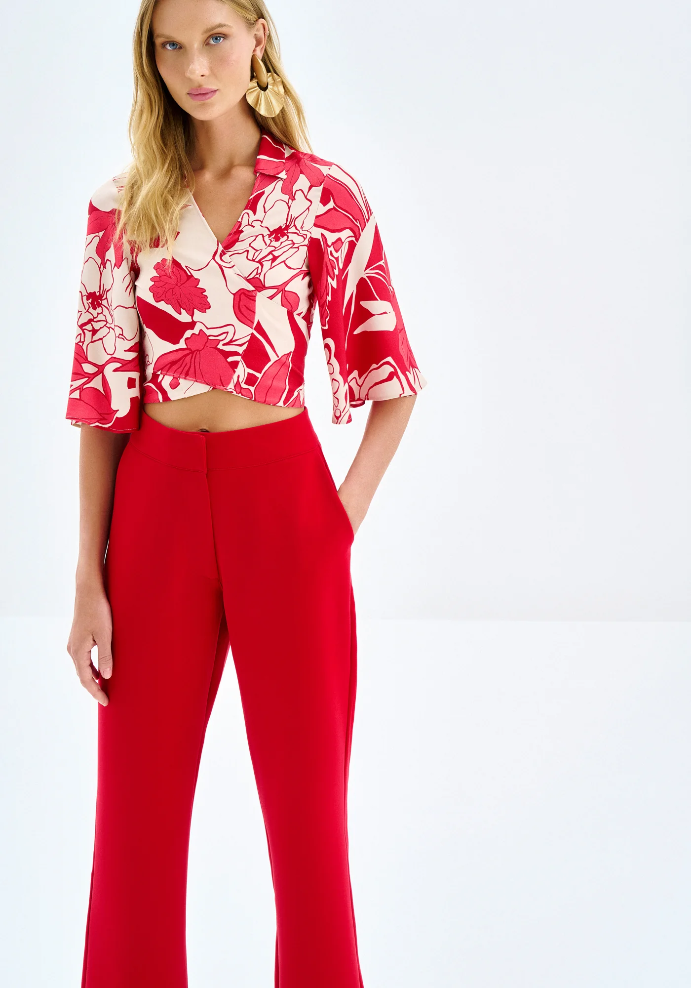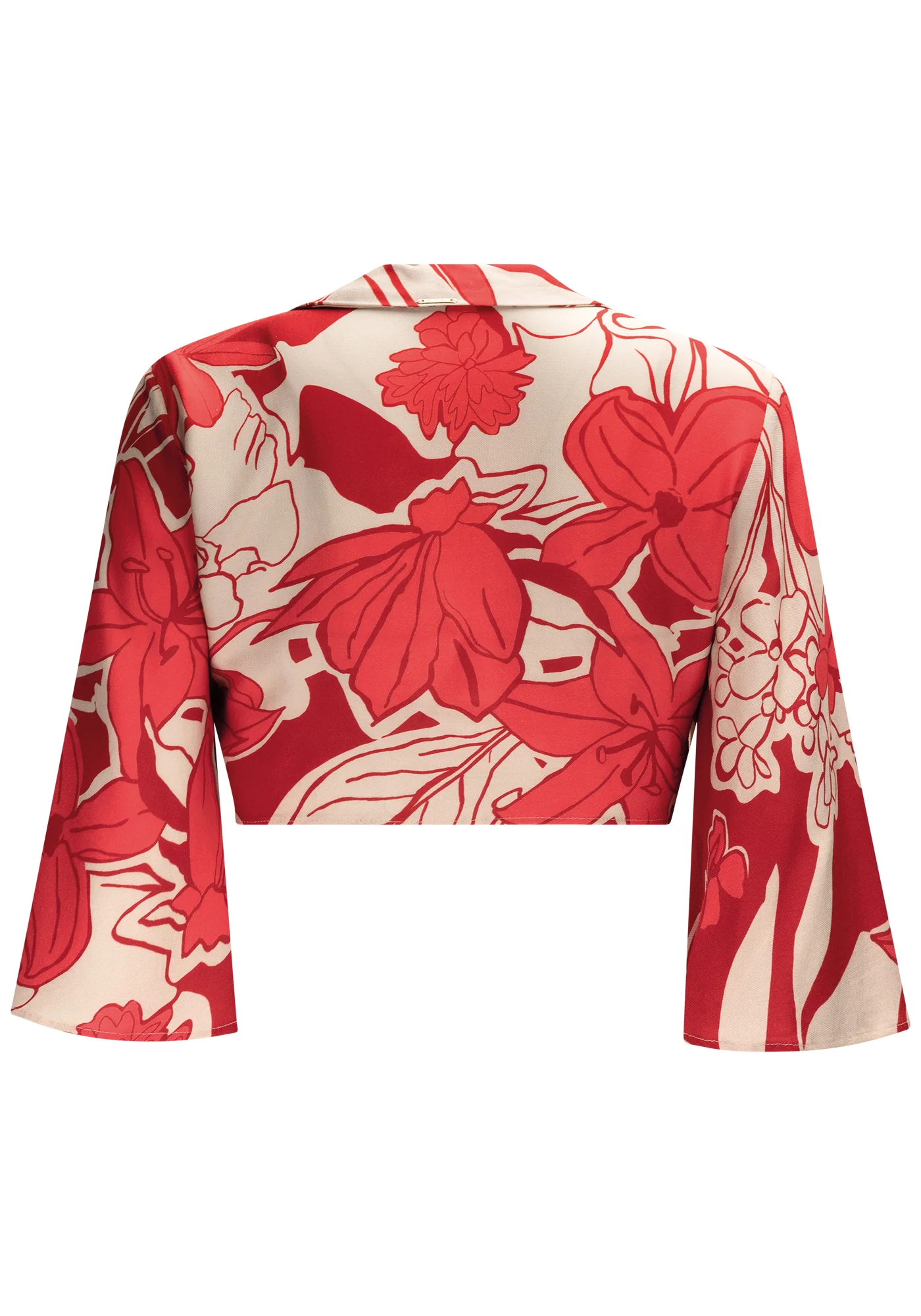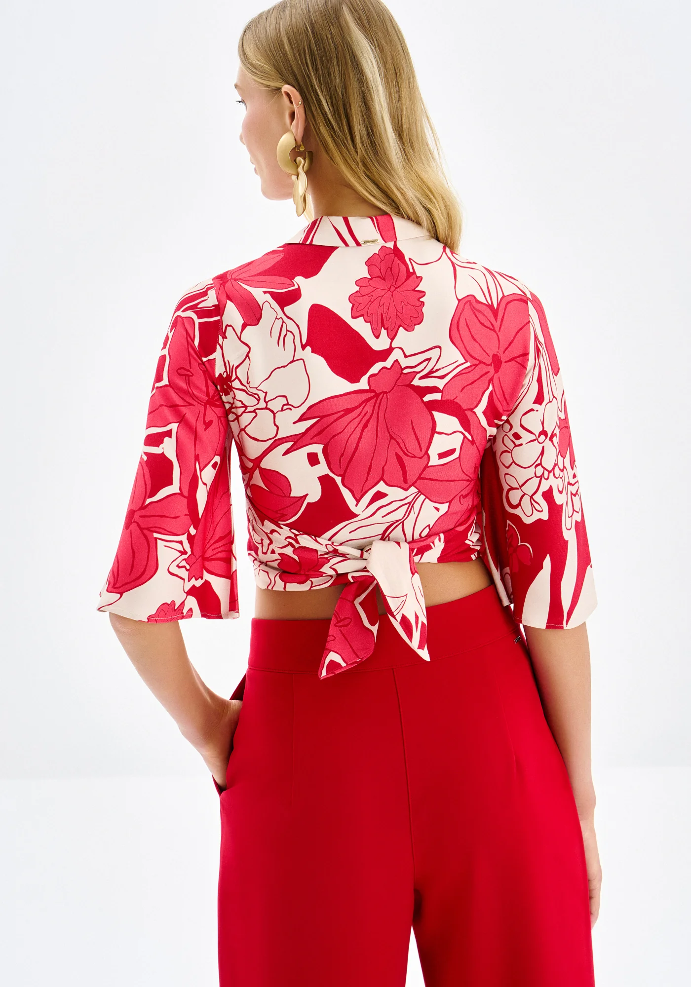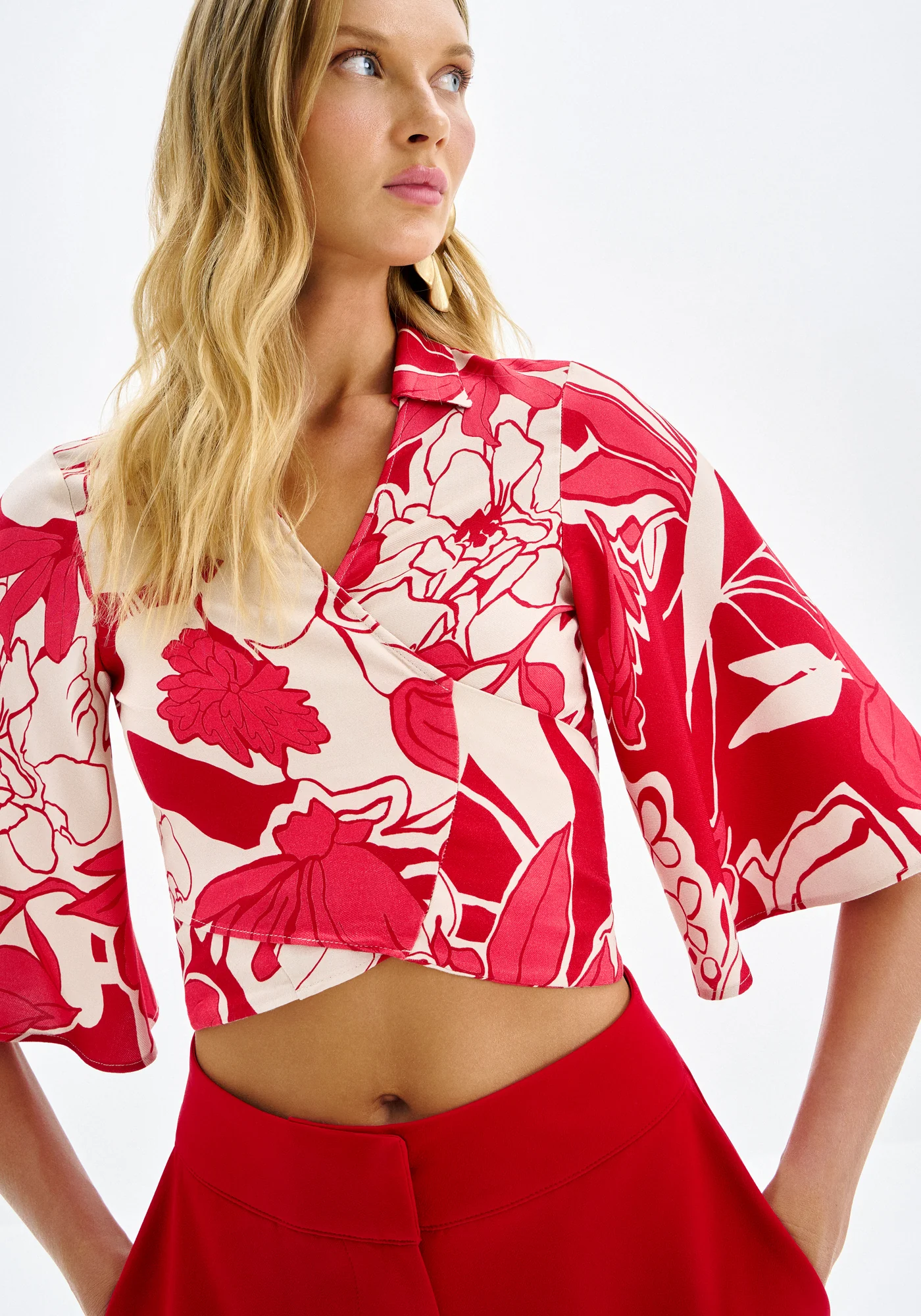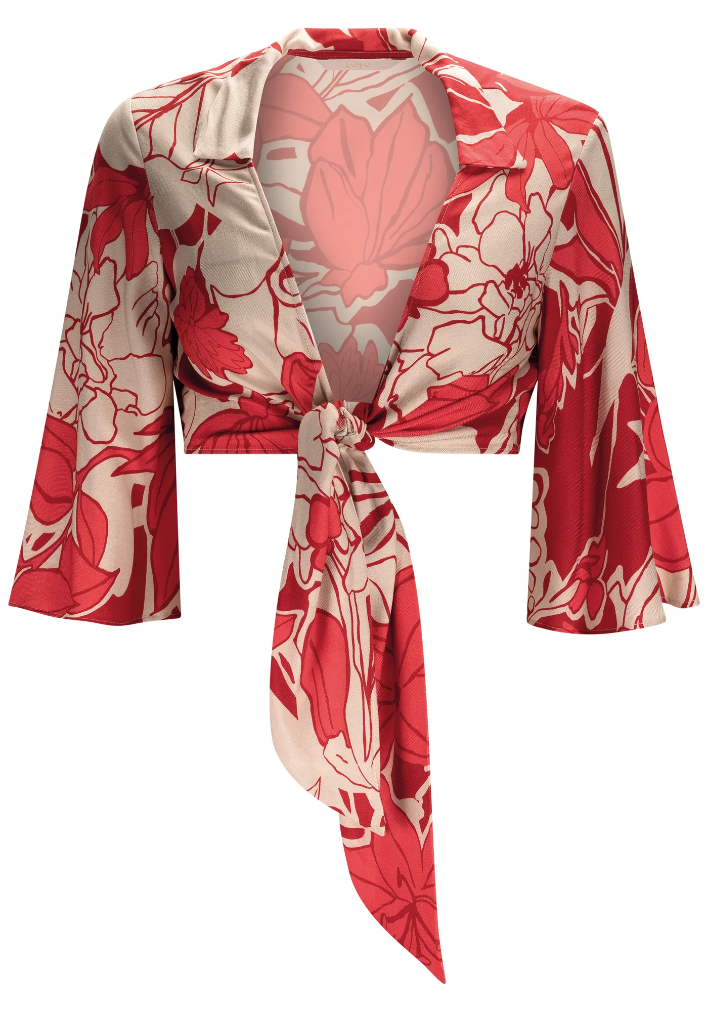 Fabricado en Rayon Twill, una viscosa más gruesa y de textura ligera. Pieza de la Colección Iris con diseño envolvente con lazo en la espalda, largo cropped, manga 3/4 flare, cuello y estampado rotatorio (pueden presentarse variaciones en la ubicación de los elementos).