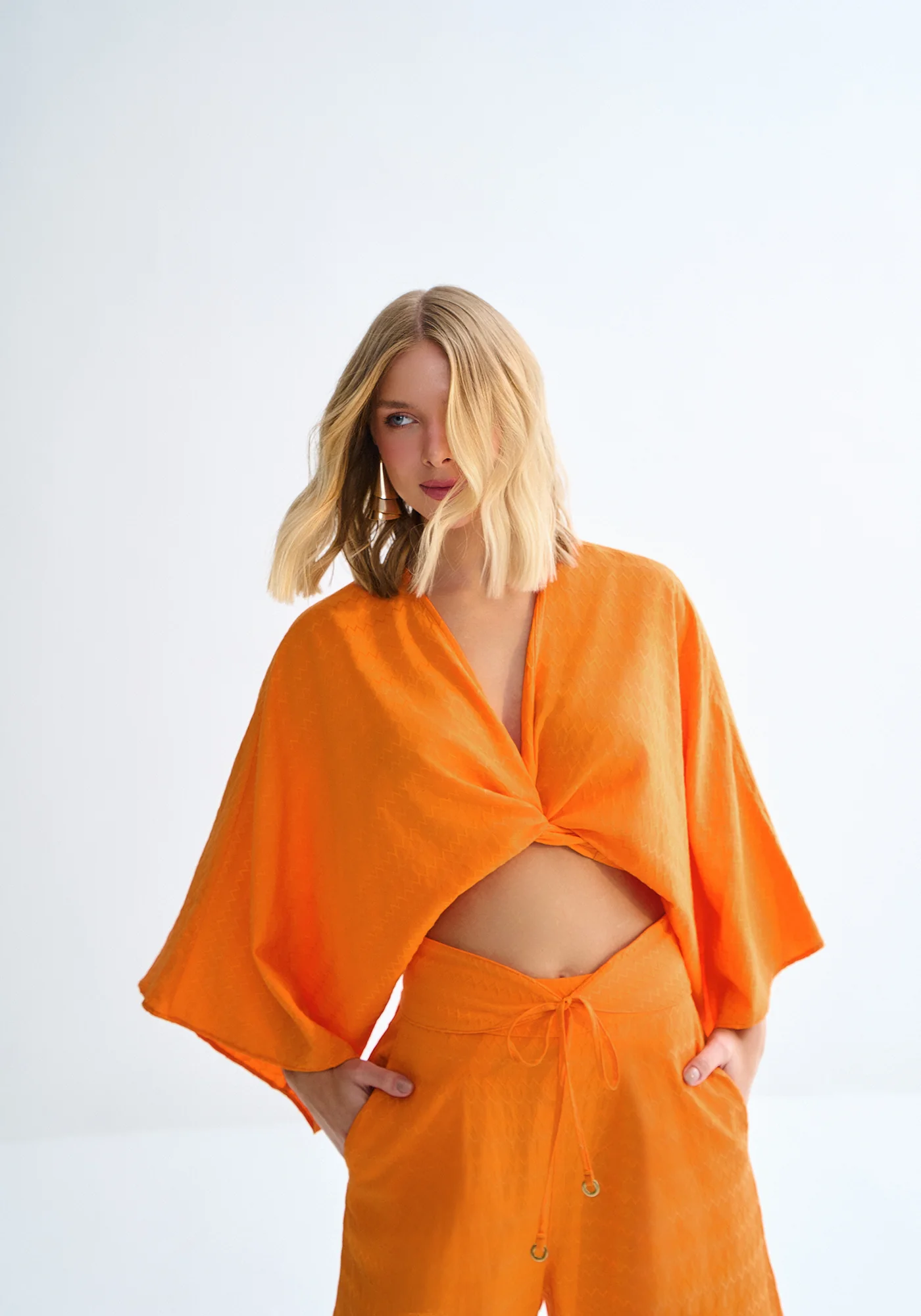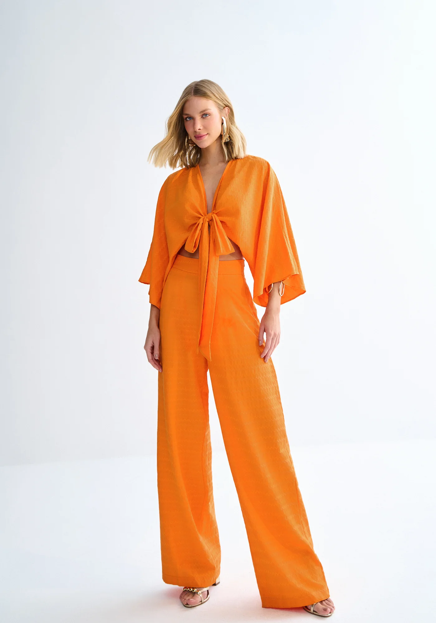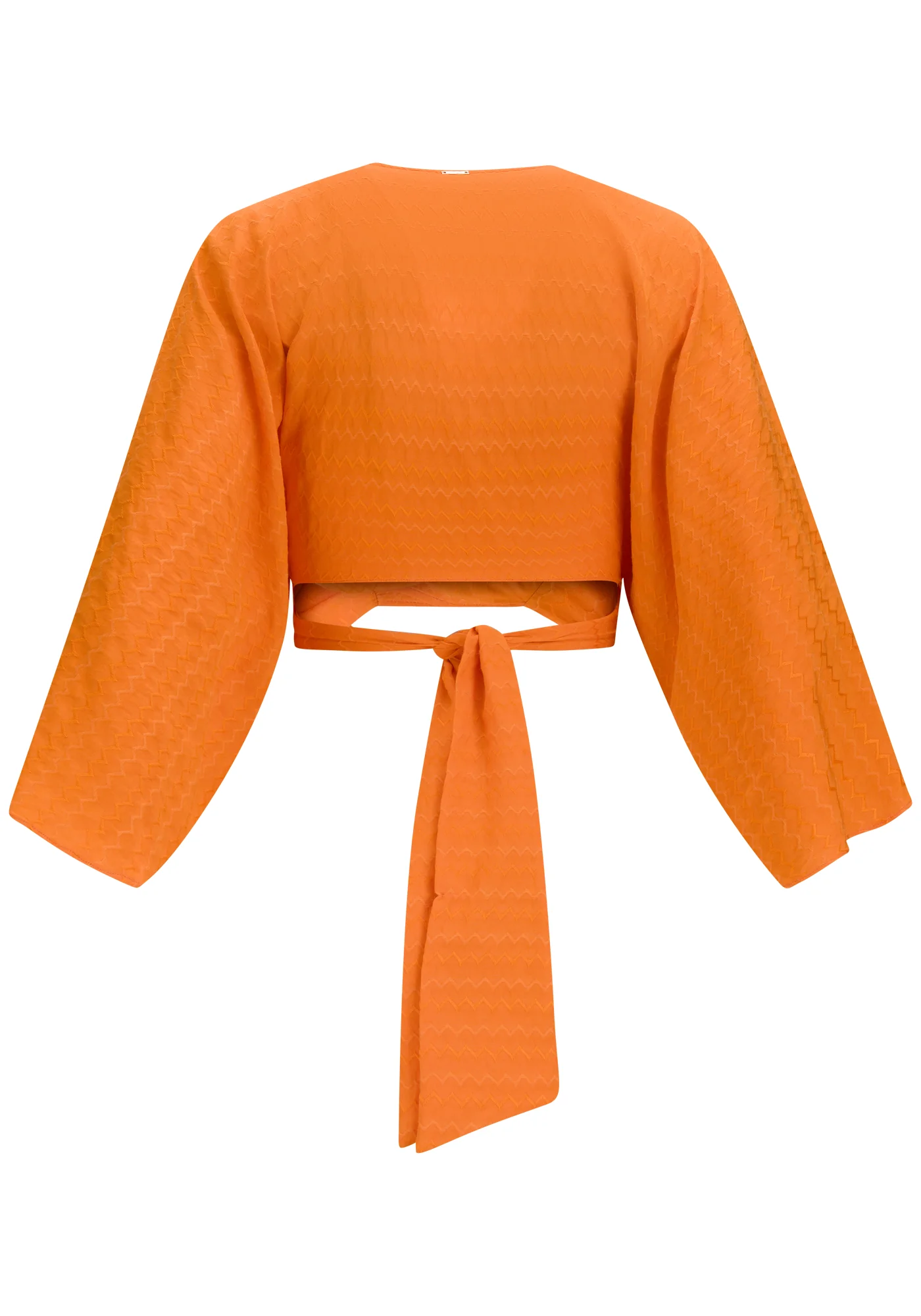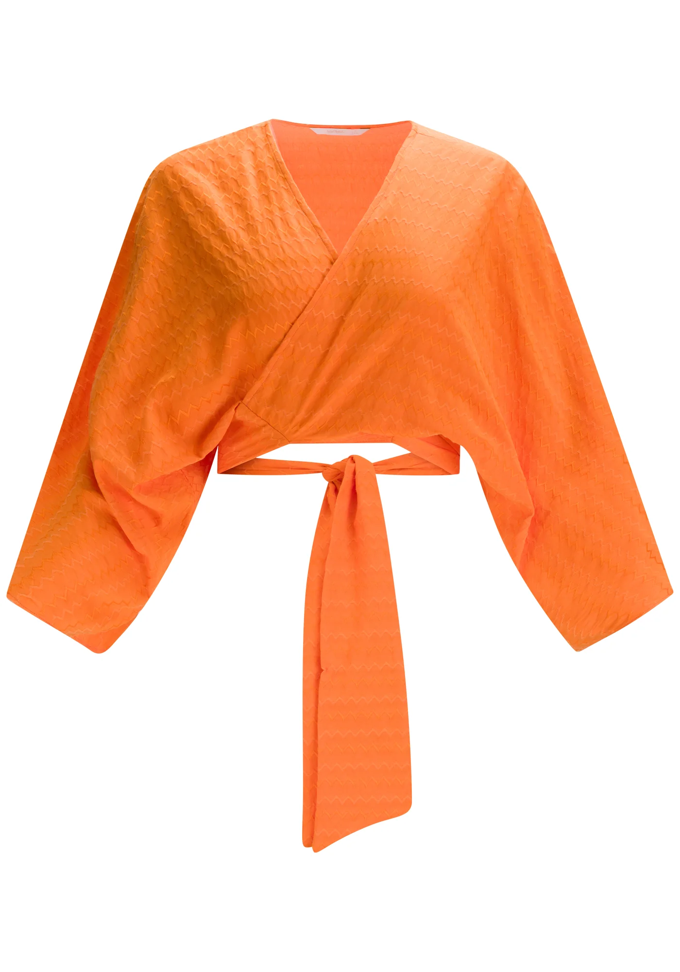 Fabricado en tejido Jacquard, base mixta de poliéster, viscosa y algodón de tacto suave y estampado chevron. Pieza de la Colección Mirage con largo cropped, mangas anchas 3/4 y diseño cruzado con lazo en la cintura. *Viscosa responsable elaborada a partir de celulosa de madera, siguiendo estándares socioambientales en su producción.