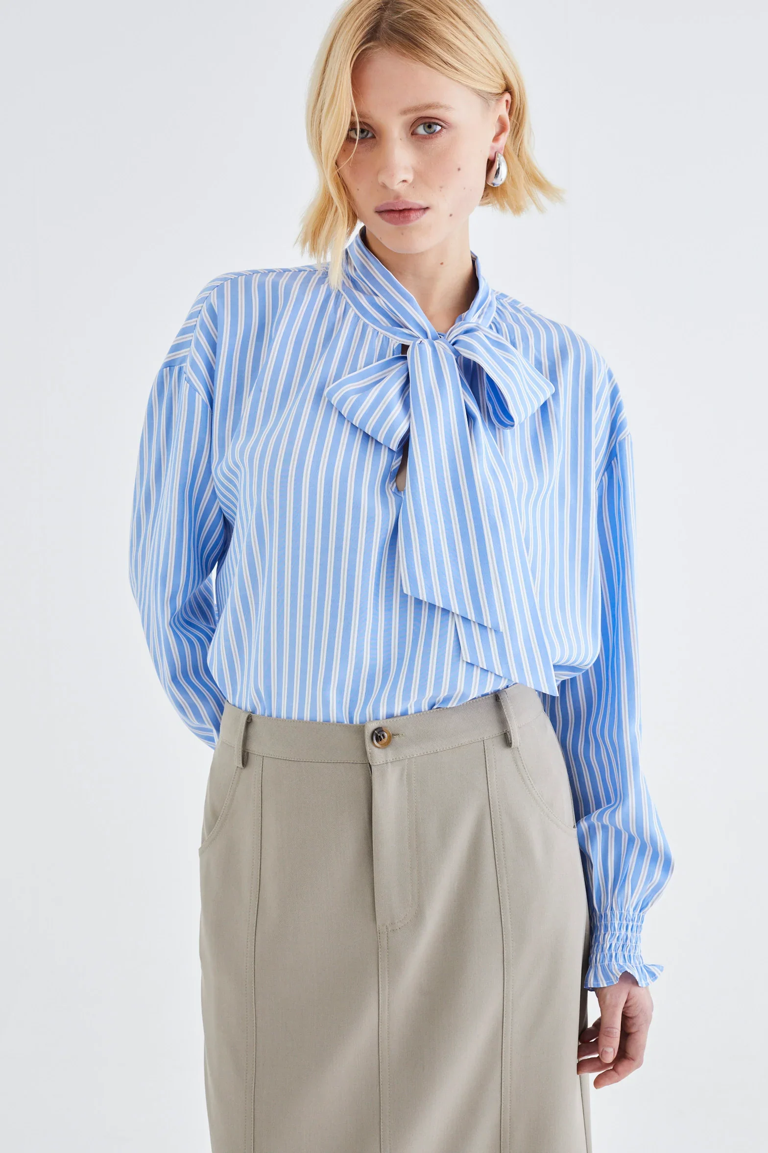 La blusa ENO de rayas azules presenta un refinado detalle de lazo que se puede dejar desatado con elegancia para un look relajado y elegante. Este básico sofisticado combina rayas clásicas con una silueta sofisticada, convirtiéndola en una prenda versátil para cualquier armario. Perfecta tanto para entornos profesionales como para un estilo casual con estilo.