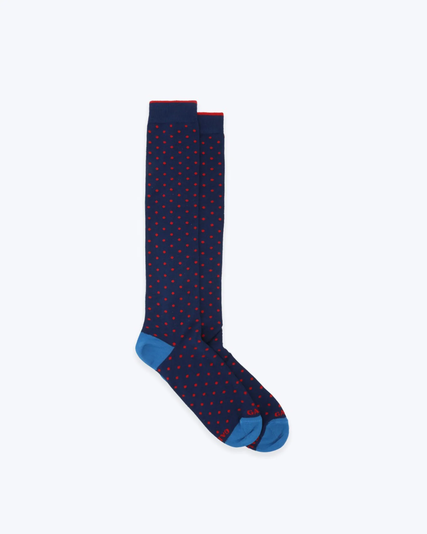 Calcetines de la marca Gallo en azul con topos en rojo.