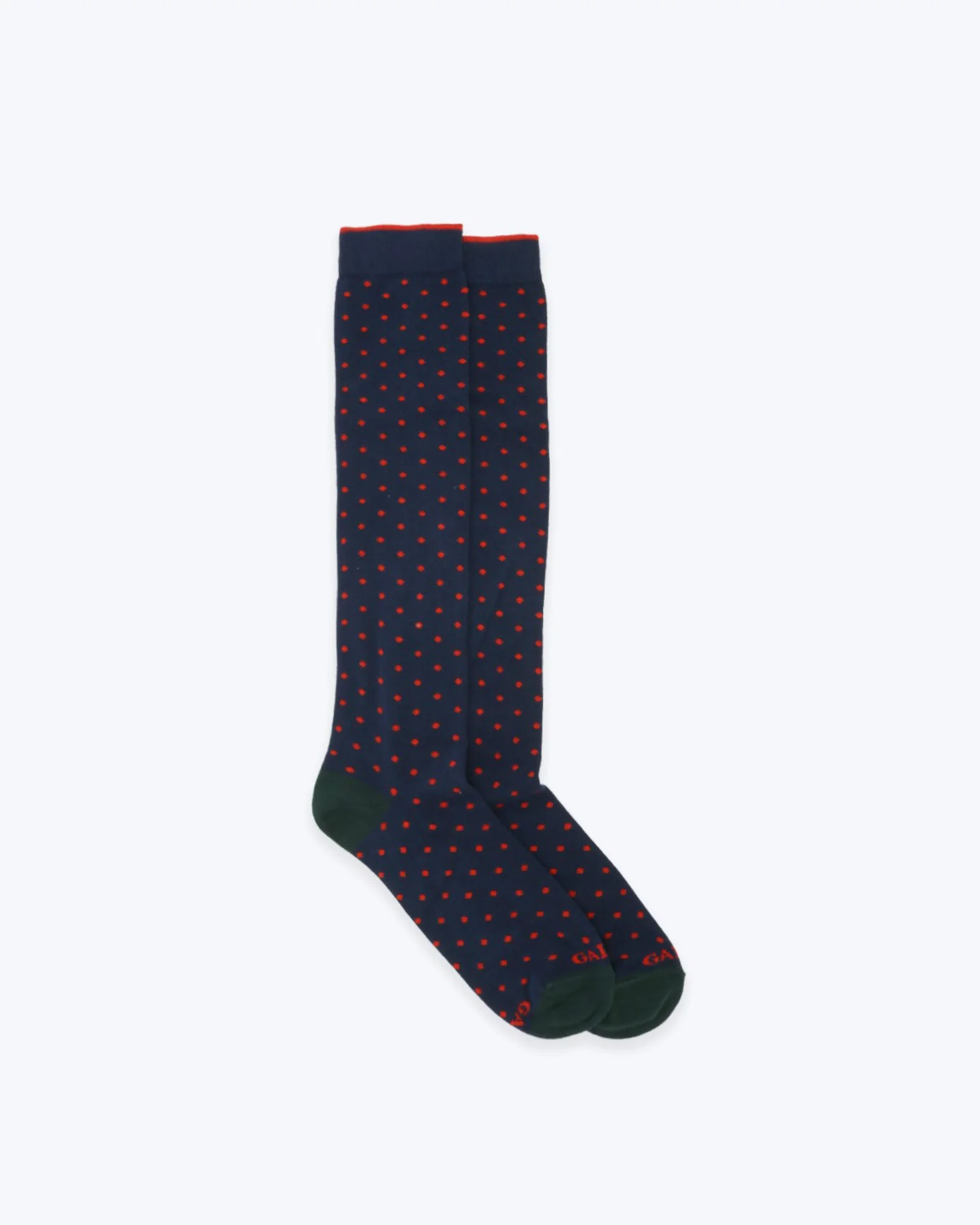 Calcetines de algodón de caña alta en color azul con topos rojos. Puntera y talón color verde y faja beige con línea roja.