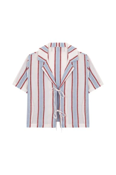 Camisa de manga corta y cierre mediante lazadas. Cuello en pico y con solapa.