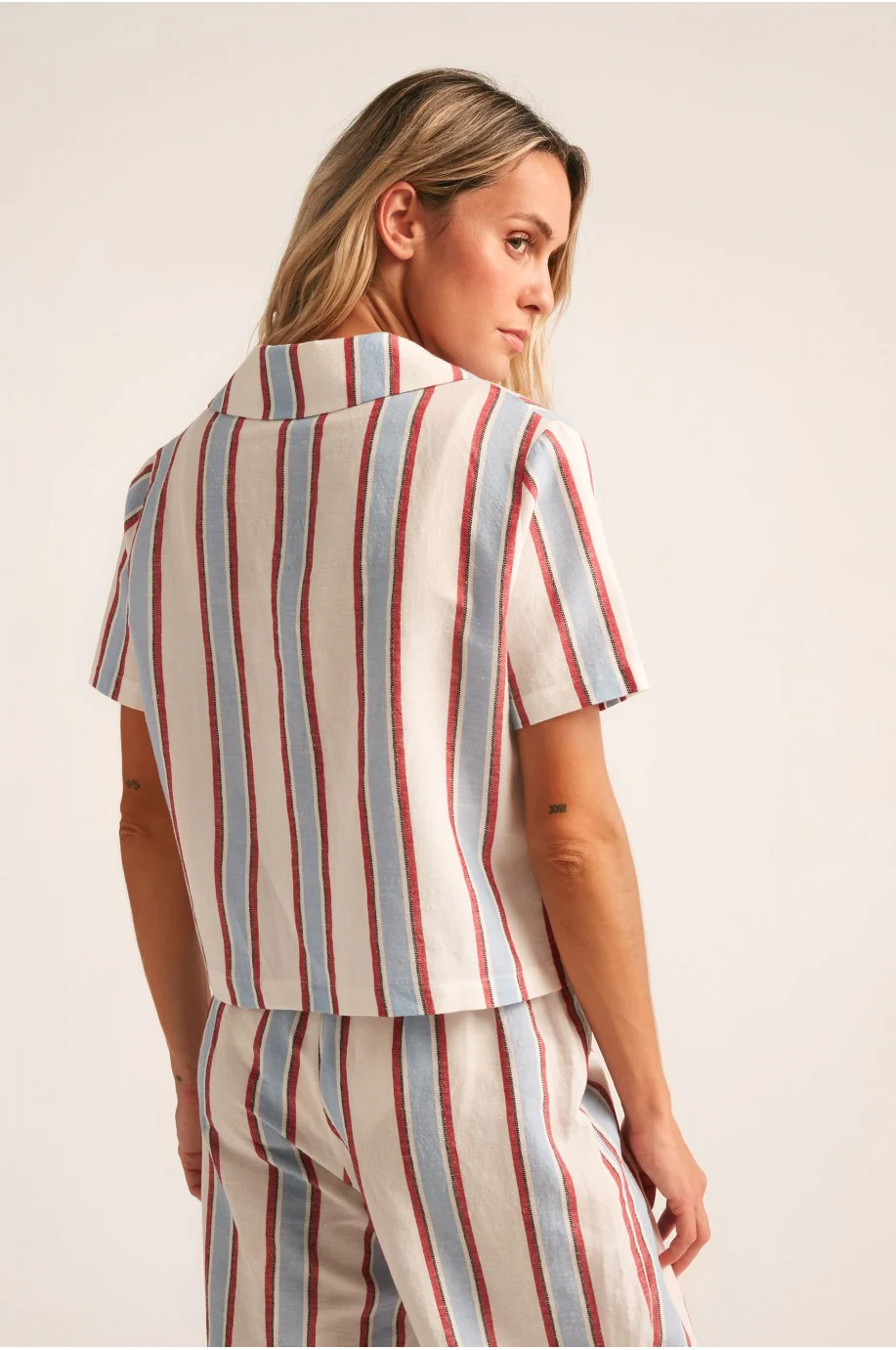 Camisa de tejiduría en algodón con listas de color azul claro y rojo sobre fondo crudo.