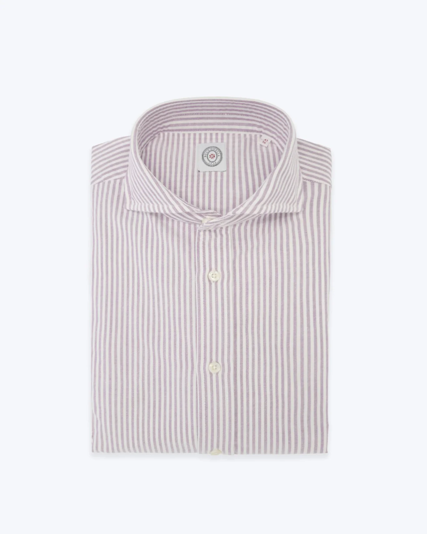 Camisa de rayas violetas y blancas, de la marca italiana Bolzonella. Tiene el cuello cutaway y tapeta con botones.