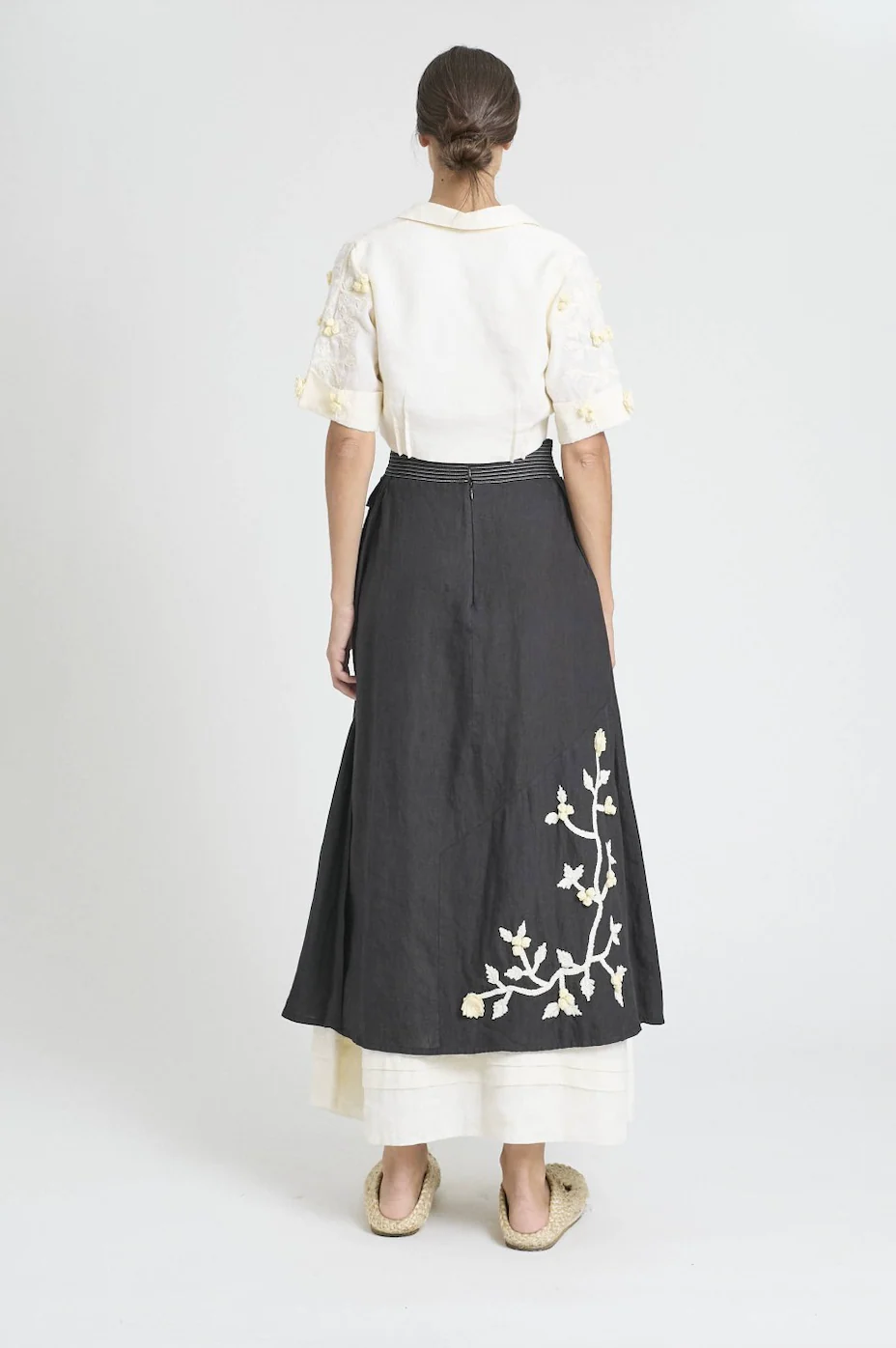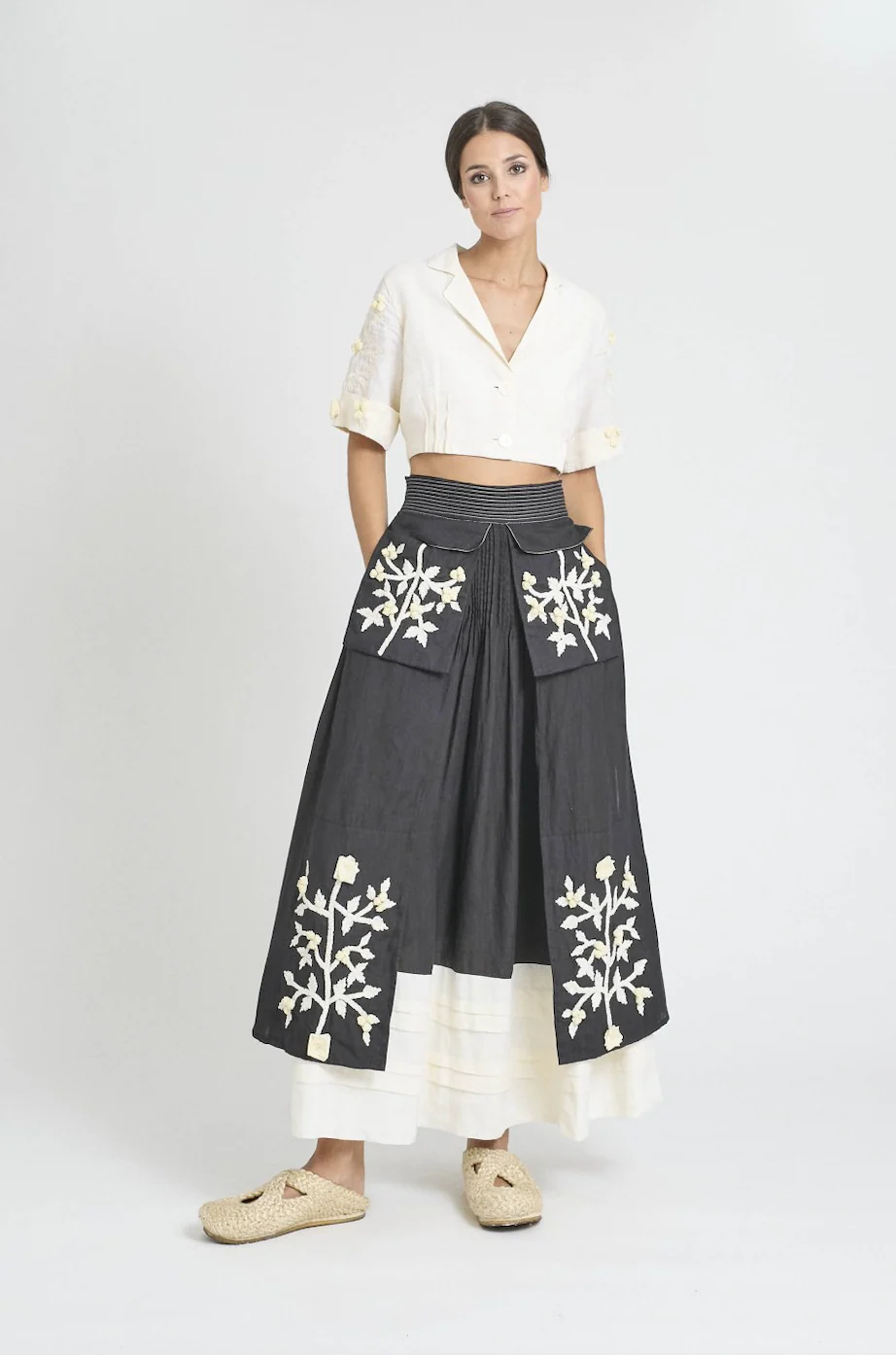 Camisa corta, botonadura delantera y bordado en mangas