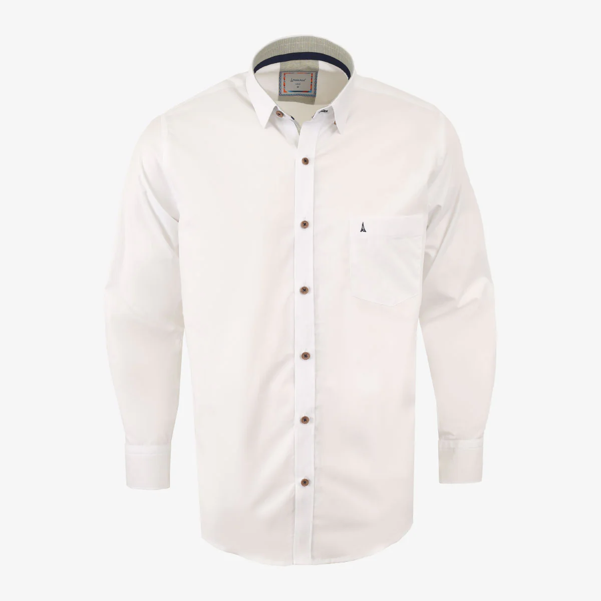 Esta camisa manga larga blanca con silueta custom está confeccionada 100% en algodón, garantizando comodidad y durabilidad. Su diseño incluye un bolsillo sencillo en el pecho con detalle bordado, cuello con banda en contraste y mini botón oculto para un ajuste impecable. El ruedo redondo y las mangas largas con puños en contraste aportan un estilo limpio y versátil.