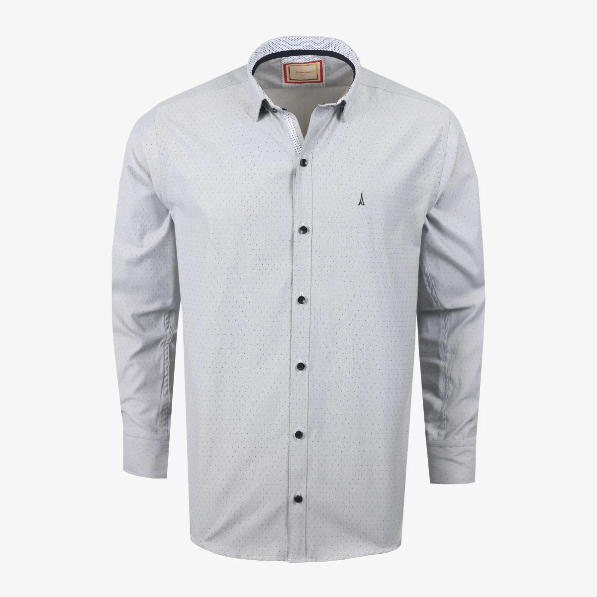 Descubre esta camisa custom de manga larga en un tono gris claro con un delicado patrón de microdibujo en puntos oscuros que aporta textura visual sin perder sobriedad. Confeccionada en una mezcla de poliéster 55% y algodón 45%, esta camisa ofrece una combinación perfecta entre durabilidad, suavidad y transpirabilidad para un uso prolongado.