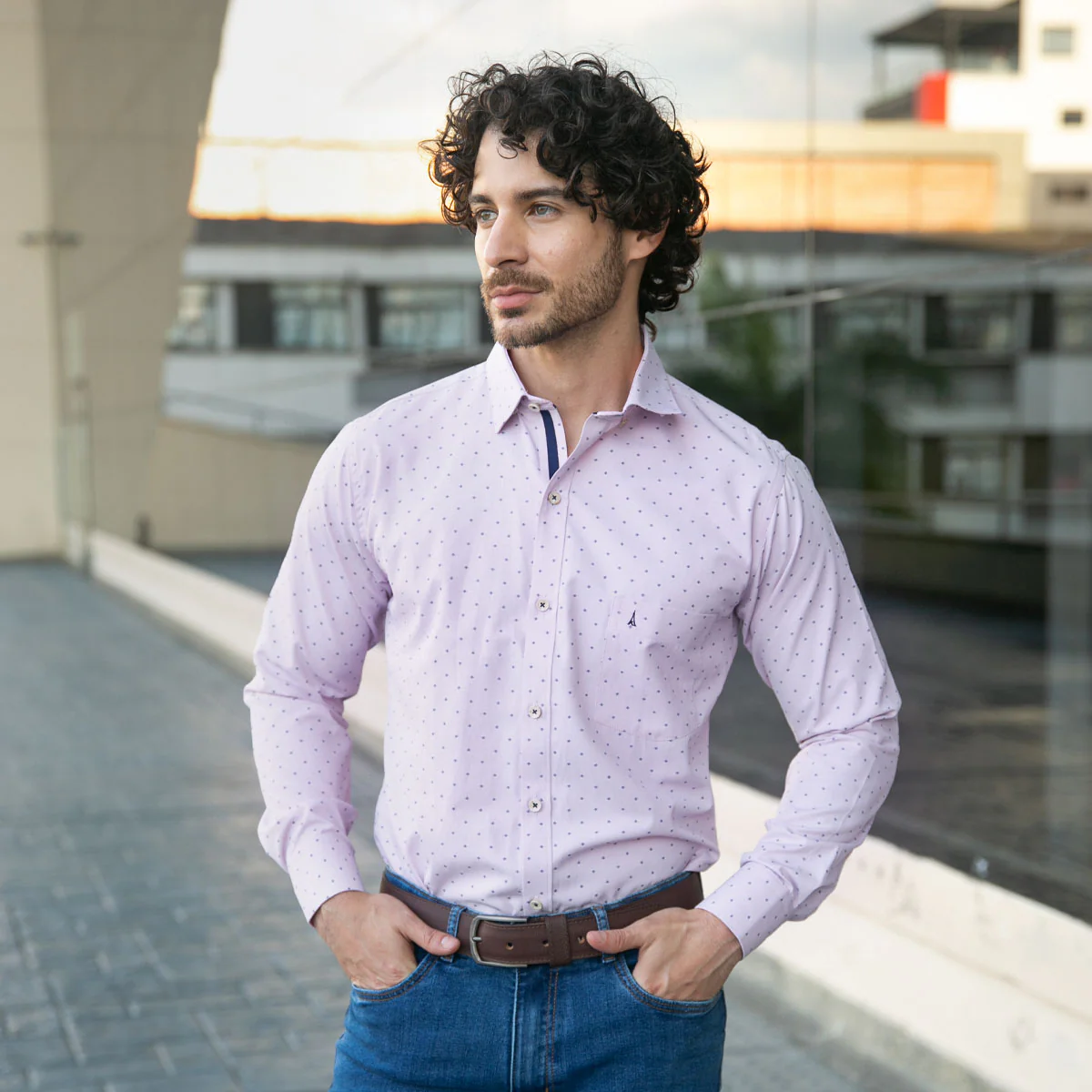 Confeccionada en una mezcla de 60% poliéster y 40% algodón, esta camisa custom ofrece una combinación ideal de durabilidad, suavidad y comodidad para el día a día. Su mini print en color azul oscuro sobre un fondo morado medio aporta un estilo sutil y contemporáneo, perfecto para quienes buscan un look con personalidad.
