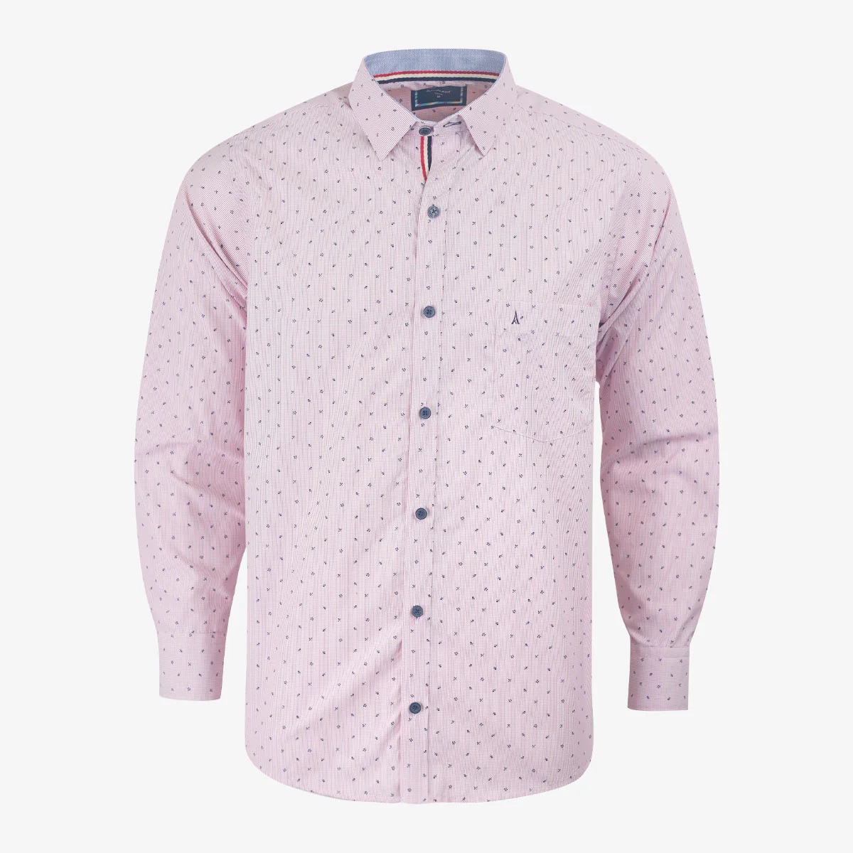 Esta camisa de silueta custom está confeccionada con una mezcla de poliéster (60%) y algodón (40%), que ofrece una textura suave, ligera y duradera. Su tejido dobby con patrón de cuadros pequeños en rojo claro y detalles en azul marino añaden un toque de estilo discreto y moderno.