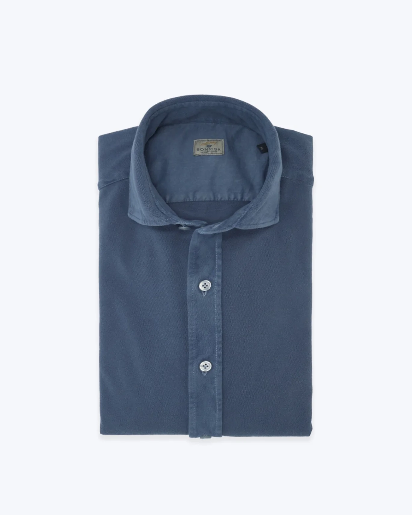 Camisa de piqué de la marca Sonrisa en color azul, con el cuello cutaway y tapeta con botones.