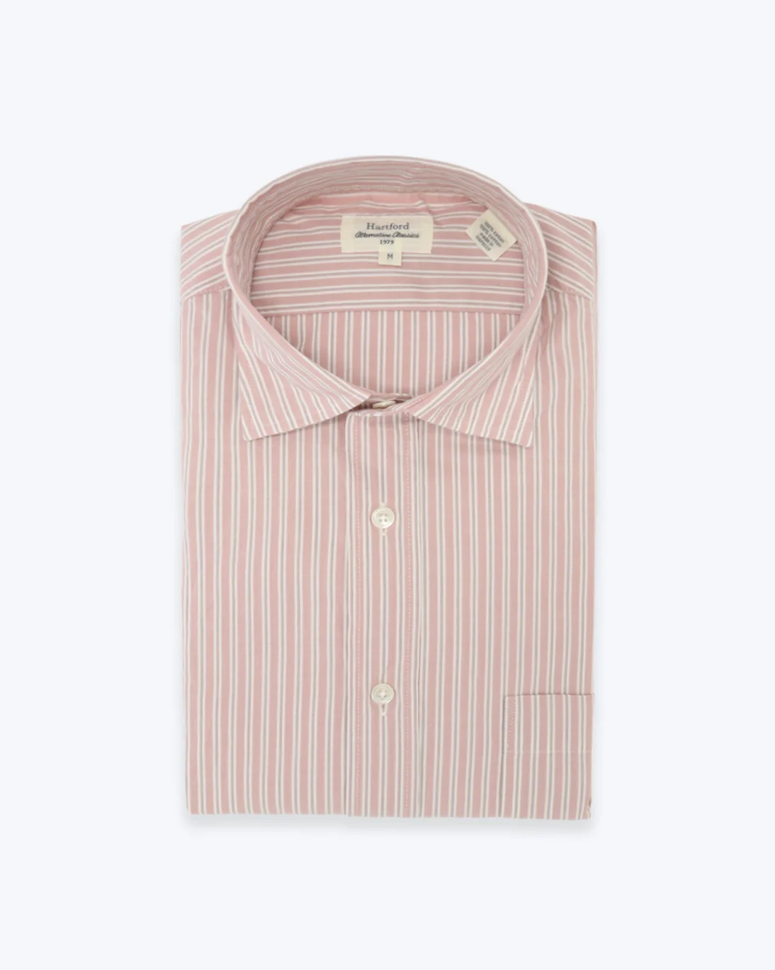 Camisa de rayas rosas y azules de la marca Hartford. Con el cuello cutaway y tapeta con botones. Además de un practico bolsillo a la altura del pecho.
