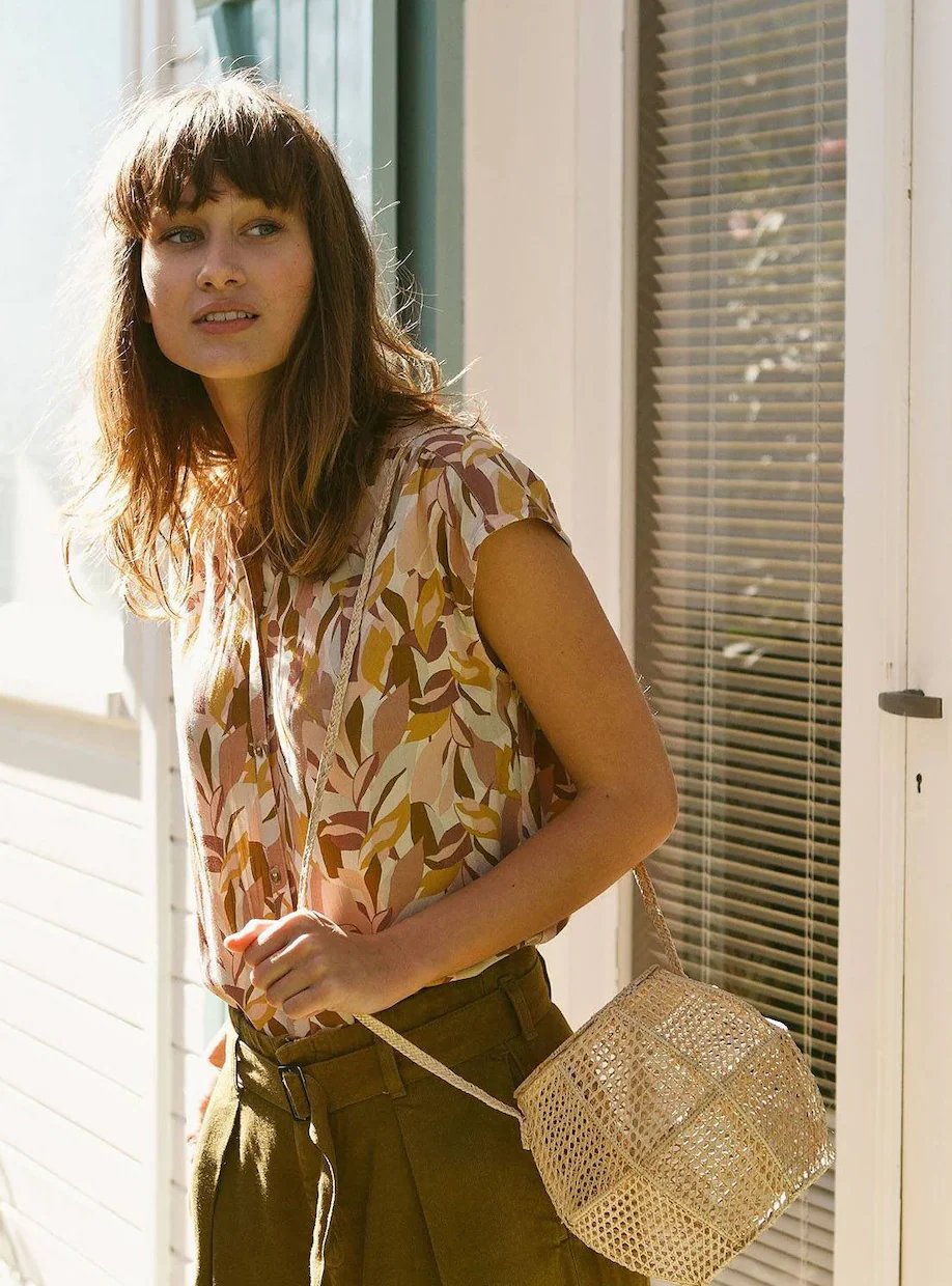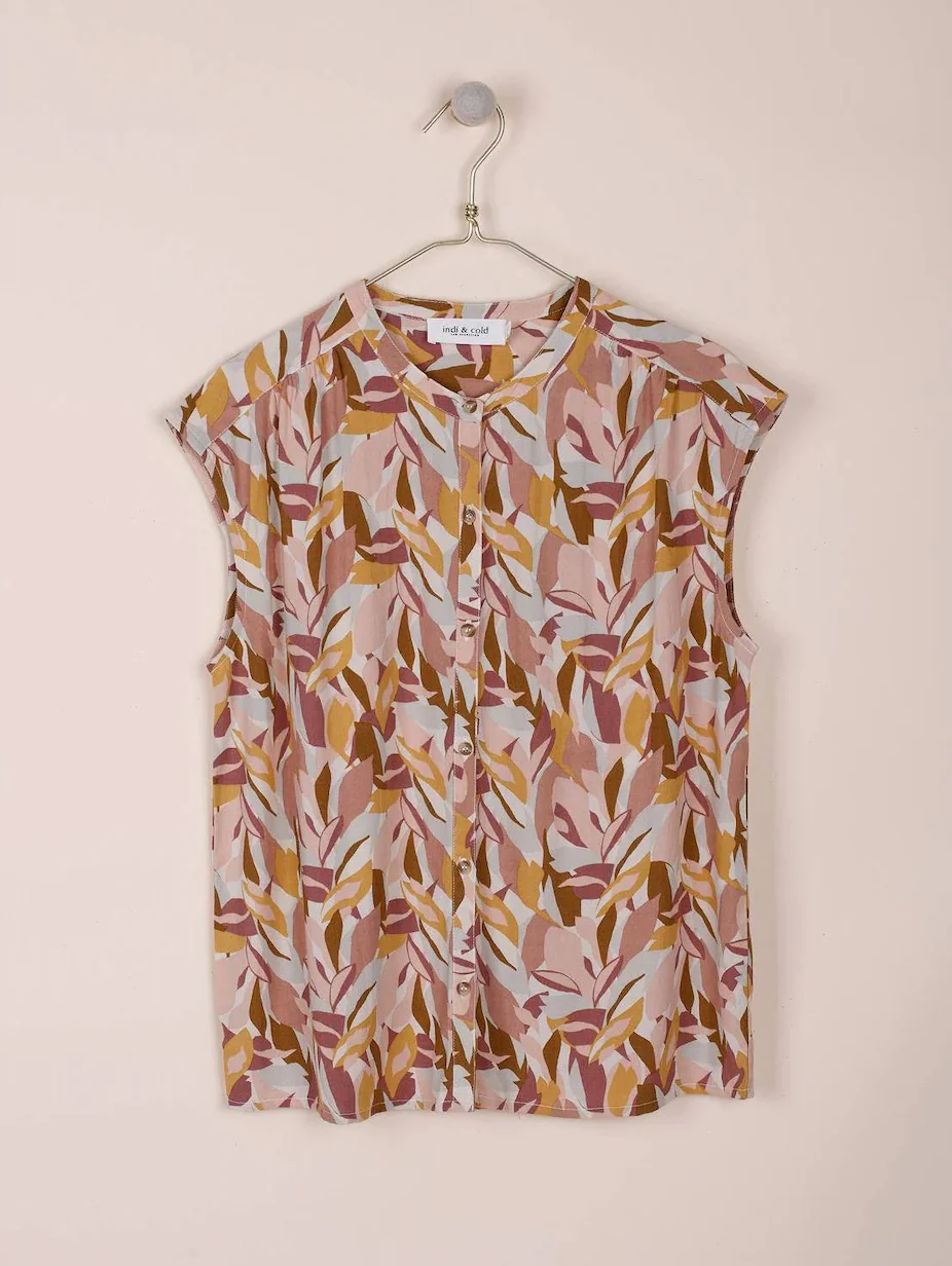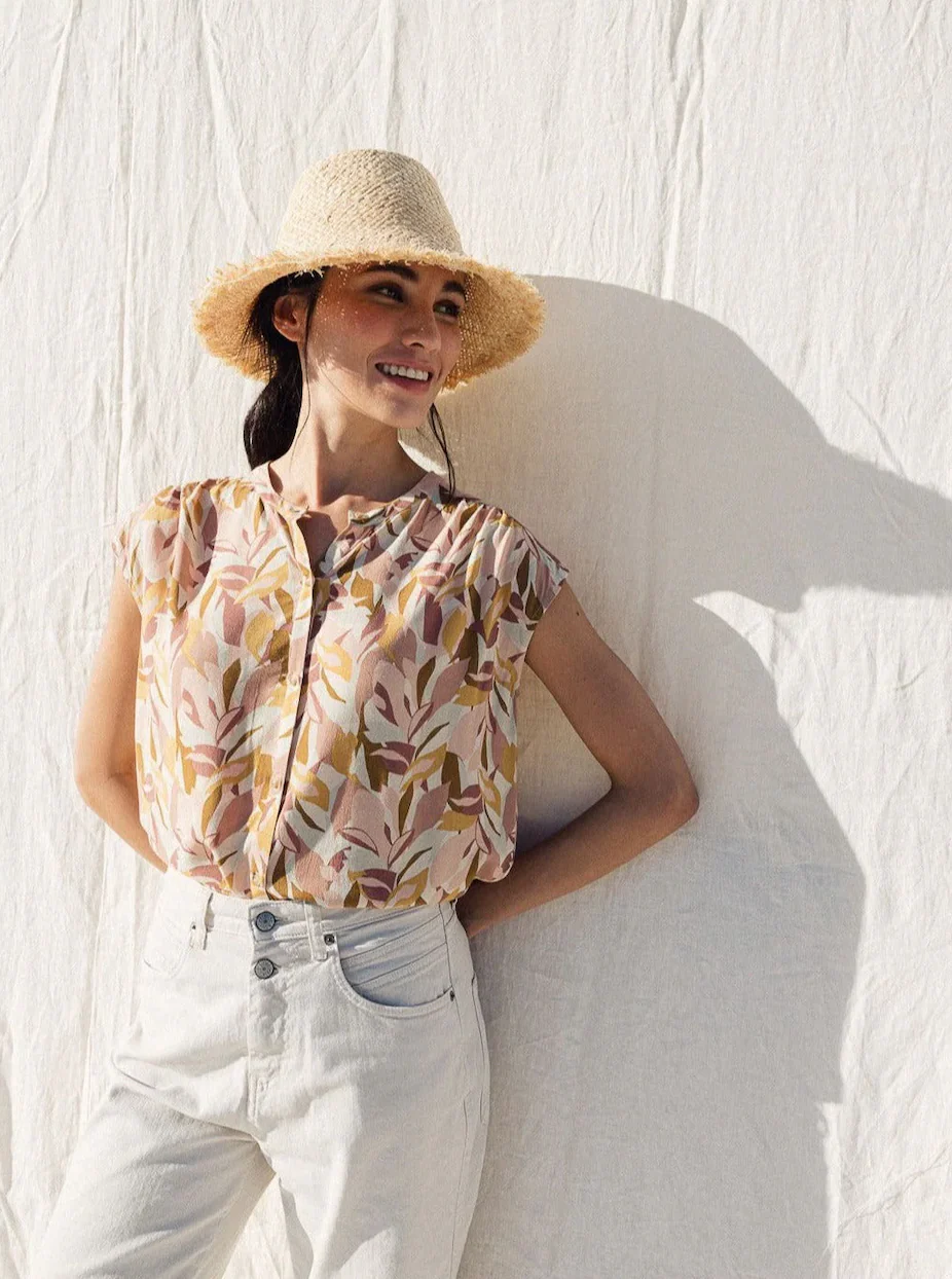 Detalles: Camisa sin mangas fluida con estampado hojas en tejido de viscosa ecovero. La modelo lleva talla S y este tipo de camisa queda holgada. Tienes unos colores ideales colores beige, ocre, malvas y color tierra.