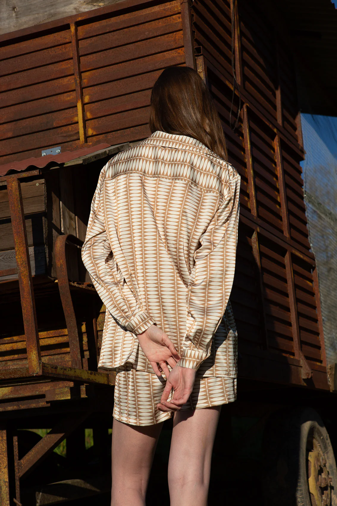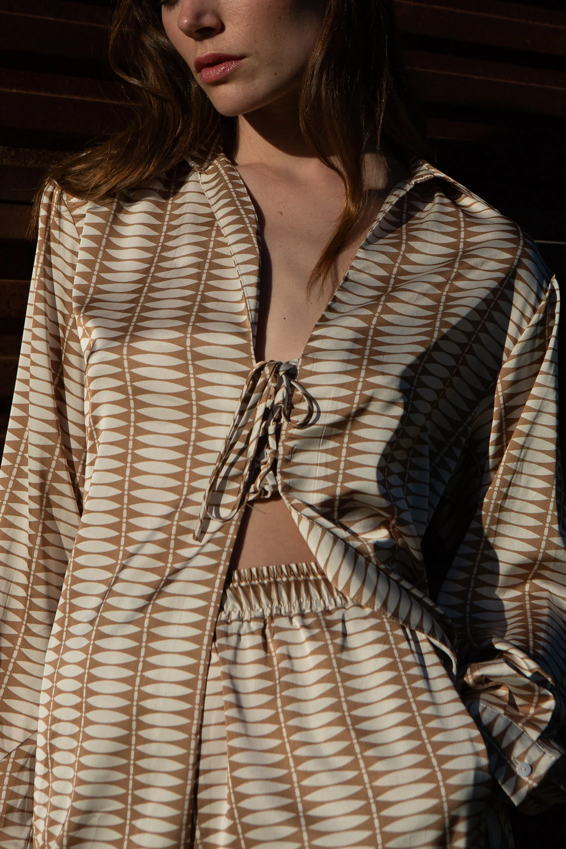 Camisa oversize con atadura de cordones delantera. Puño con botonadura y cuello camisero.