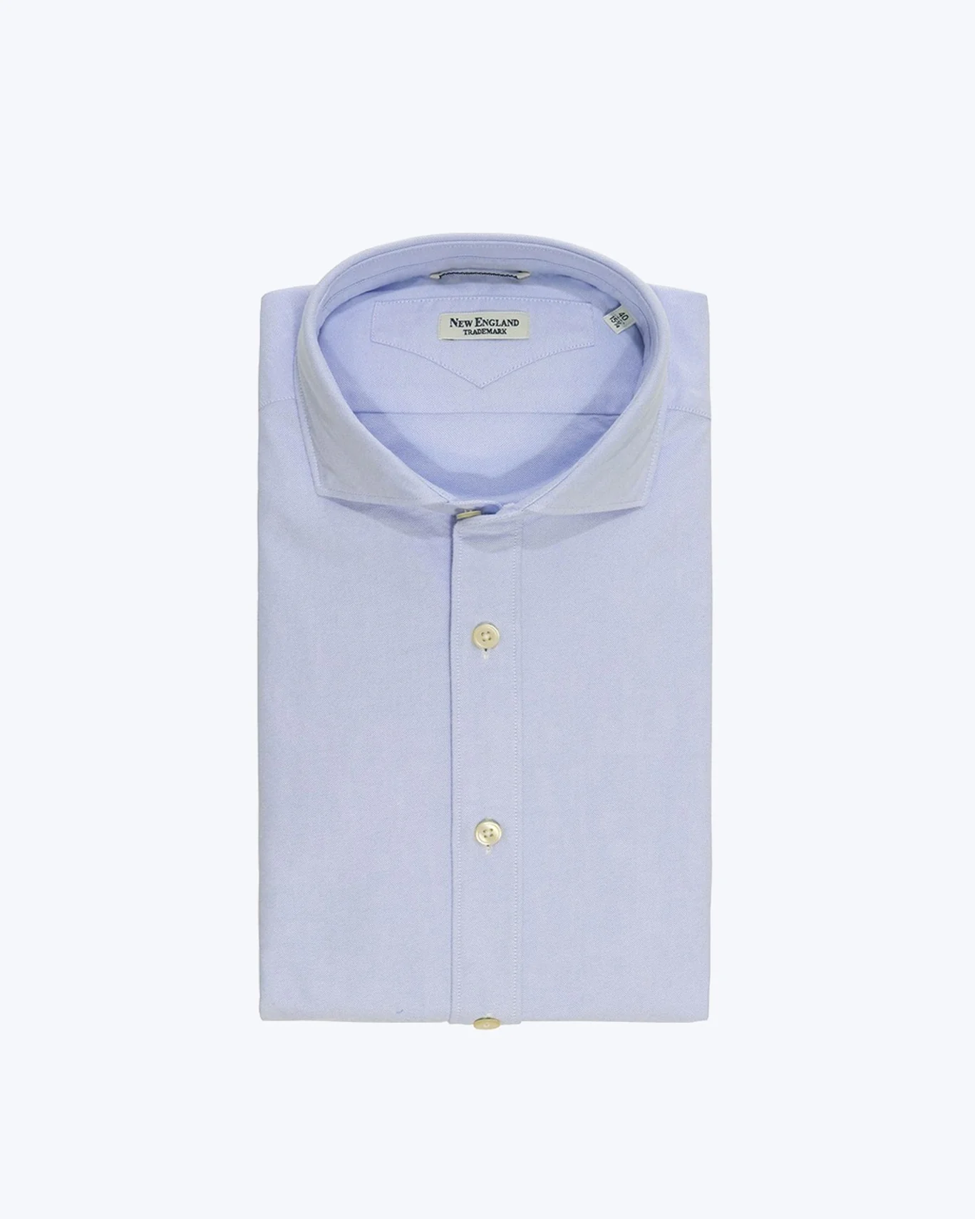 Camisa de la marca New England, de color azul. Tiene el cuello cutaway y tapeta con botones.