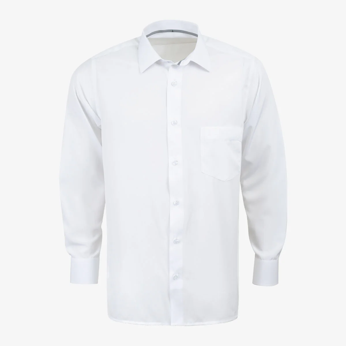 Esta camisa de silueta regular en un blanco puro está confeccionada en poliéster 100%, material que aporta resistencia y fácil cuidado.