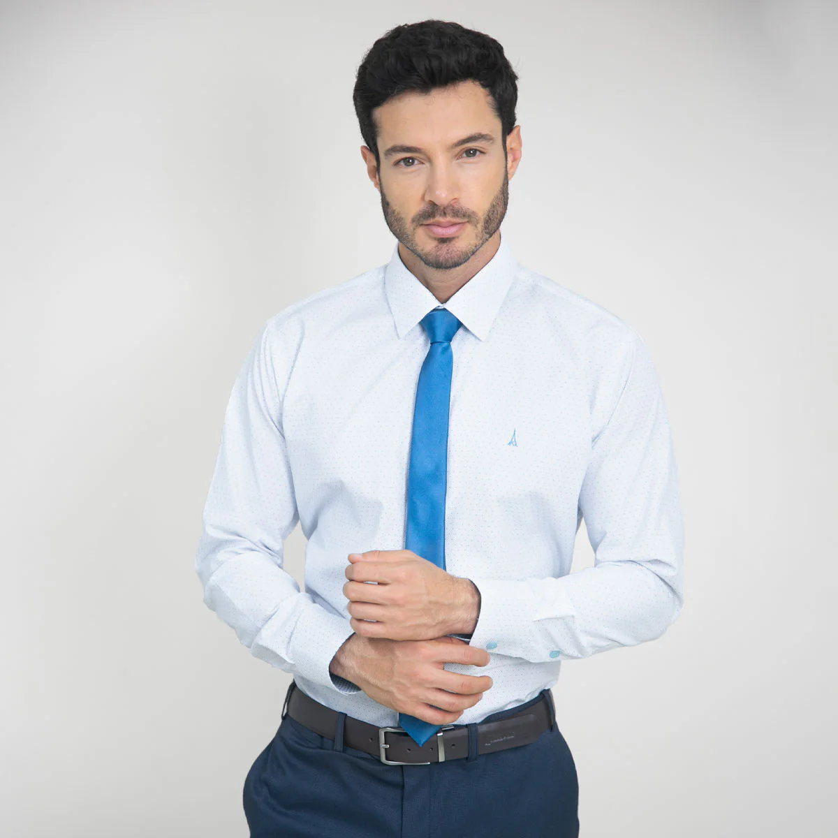 Descubre la camisa slim fit blanca con mini print azul, perfecta para un look formal y moderno. Confeccionada en una mezcla resistente y cómoda de 60% poliéster y 40% algodón, ofrece durabilidad y suavidad en cada uso.