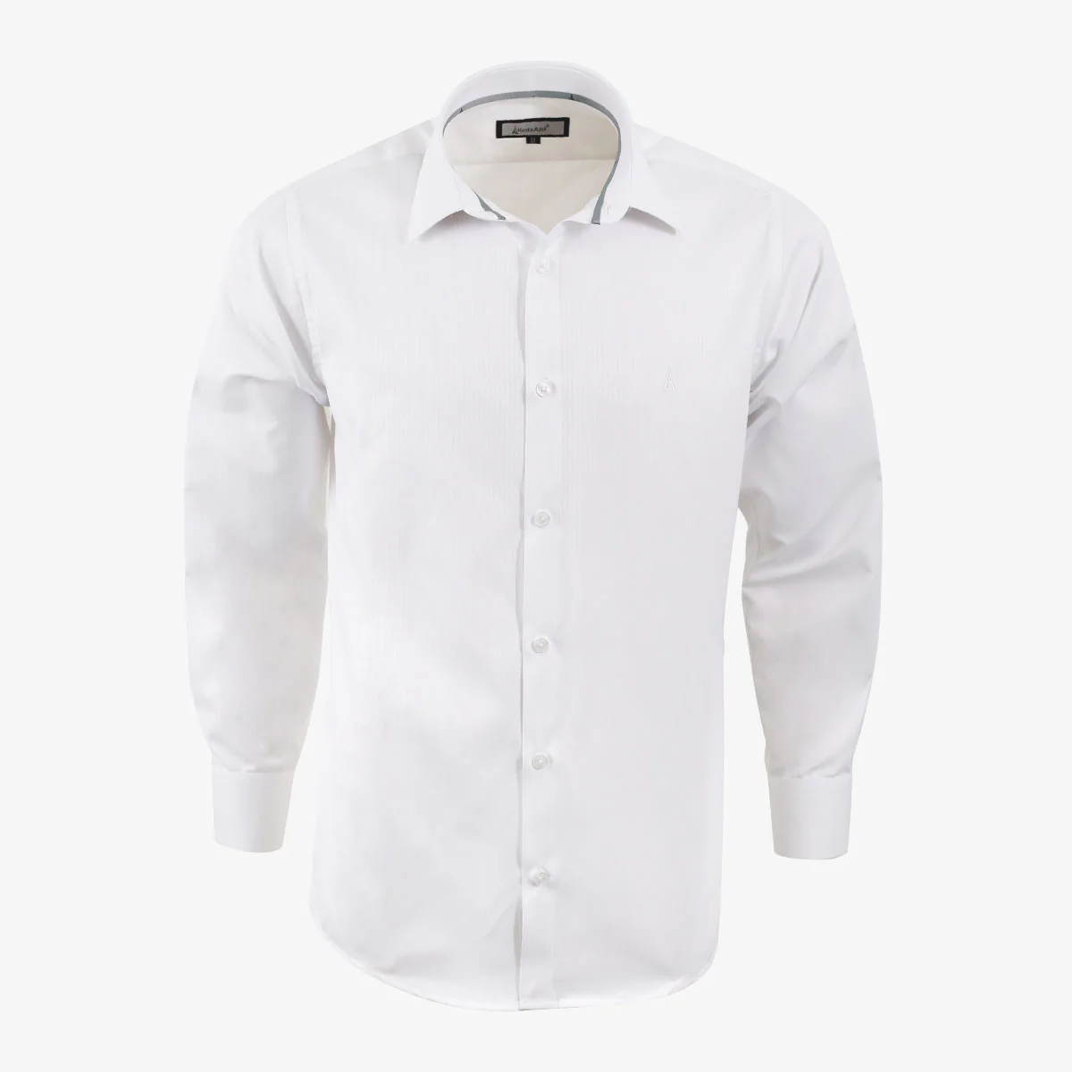 El diseño incluye un cuello clásico con cinta interna, ideal para usar con corbata, y un bordado discreto de la torre en el pecho que aporta un toque distintivo sin recargar. La camisa tiene un frente liso sin bolsillos, mangas largas con puños tradicionales y un ruedo redondo para un mejor ajuste al pantalón. Su espalda sencilla garantiza comodidad y movimiento.