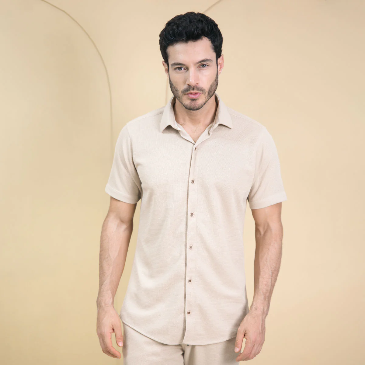 Su diseño incluye un cuello con cinta en la banda y botón oculto tipo Luigi, que ofrece un acabado limpio y moderno. La camisa tiene mangas cortas con un dobladillo sencillo y un frente con cartera doble y pespuntes finos que realzan su construcción detallada. El ruedo redondo sin aberturas laterales aporta un toque contemporáneo y facilita el uso tanto por dentro como por fuera del pantalón.