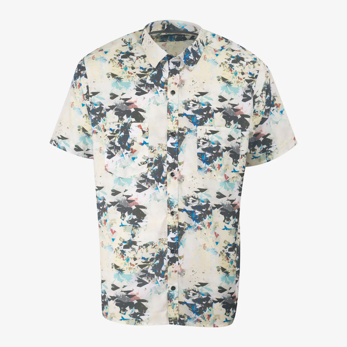 Su estampado artístico en tonos beige claro, azul turquesa, negro y detalles en rojo y verde le da un toque único y vibrante a la prenda. Cuenta con cuello Luigi mini con botón oculto y cinta en la banda, mangas cortas sencillas y bolsillos frontales con pestaña que aportan funcionalidad sin perder estilo.