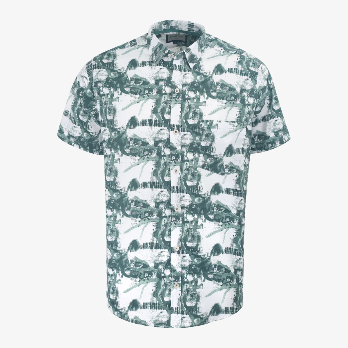 Esta camisa sport de silueta regular presenta un estampado exclusivo en tonos verde medio sobre base blanca, que le da un toque moderno y fresco. Confeccionada con 98% algodón y 2% spandex, ofrece una comodidad excepcional y libertad de movimiento gracias a su ligera elasticidad.