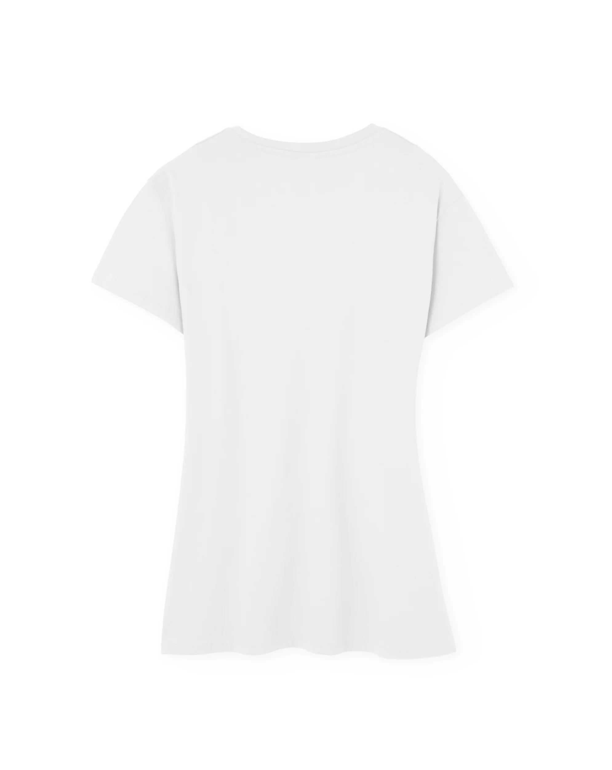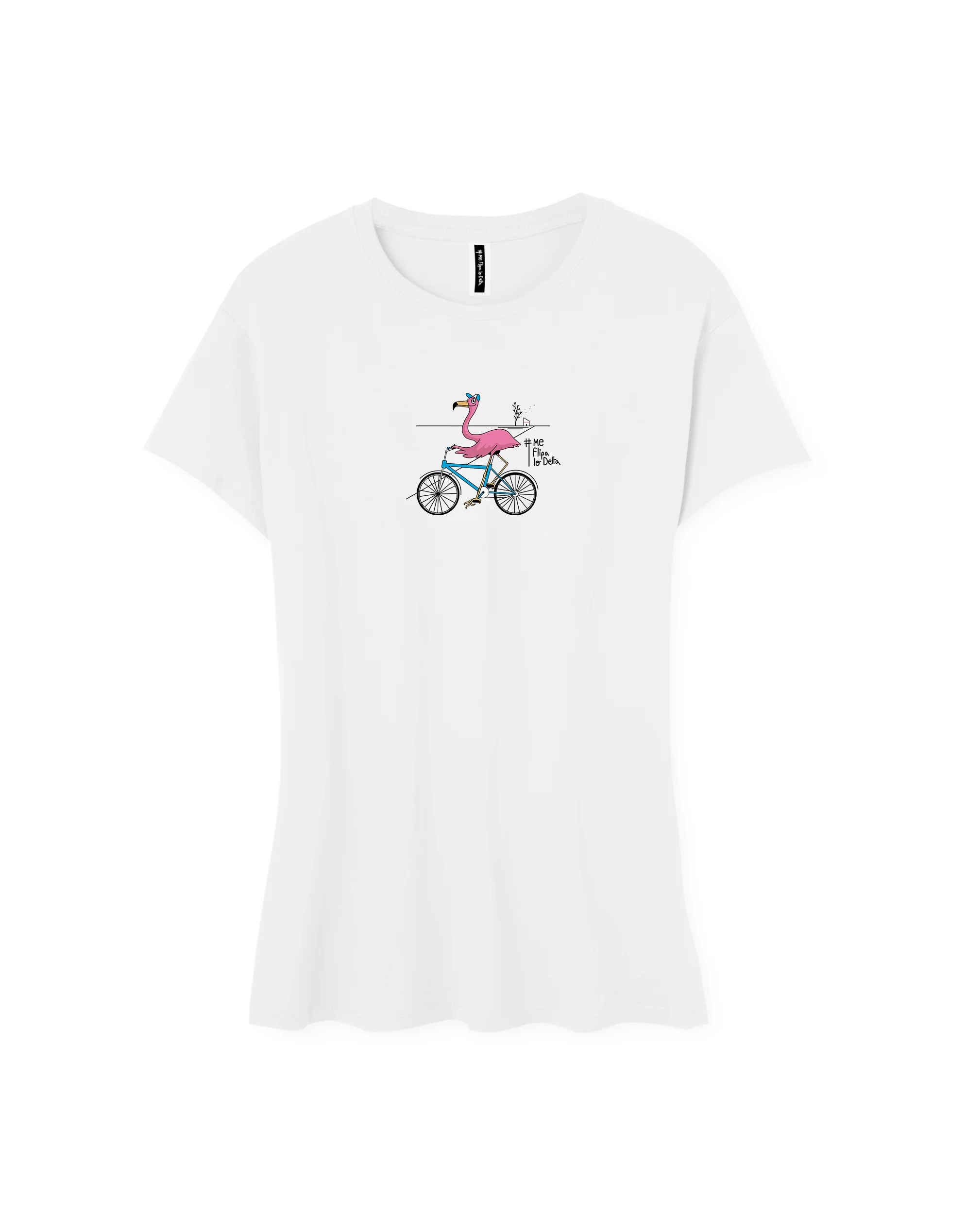 Camiseta de manga corta de mujer entallada y cuello redondo Me Flipa lo Delta en color blanco con estampado en pecho de flamenco Delta montando en bicicleta. Sí, yo también me he dado cuenta, la bici no tiene frenos. Disponible en las tallas de XS a la XXL