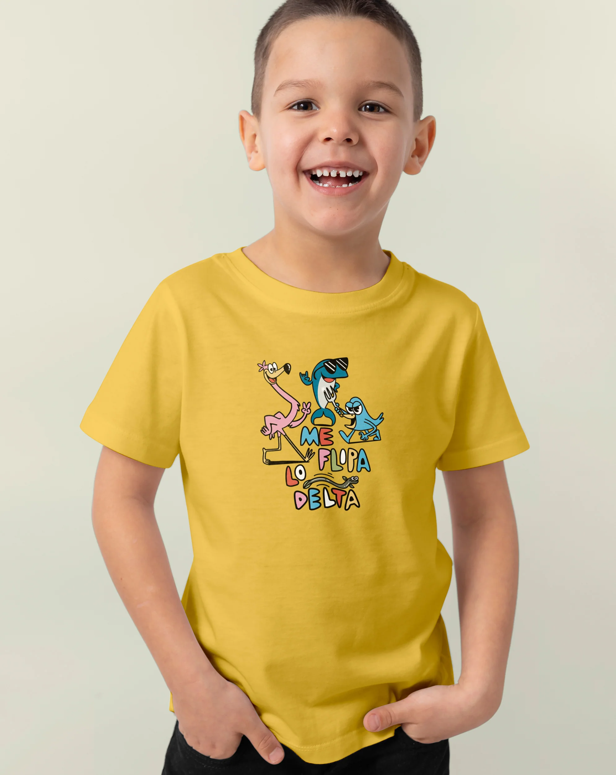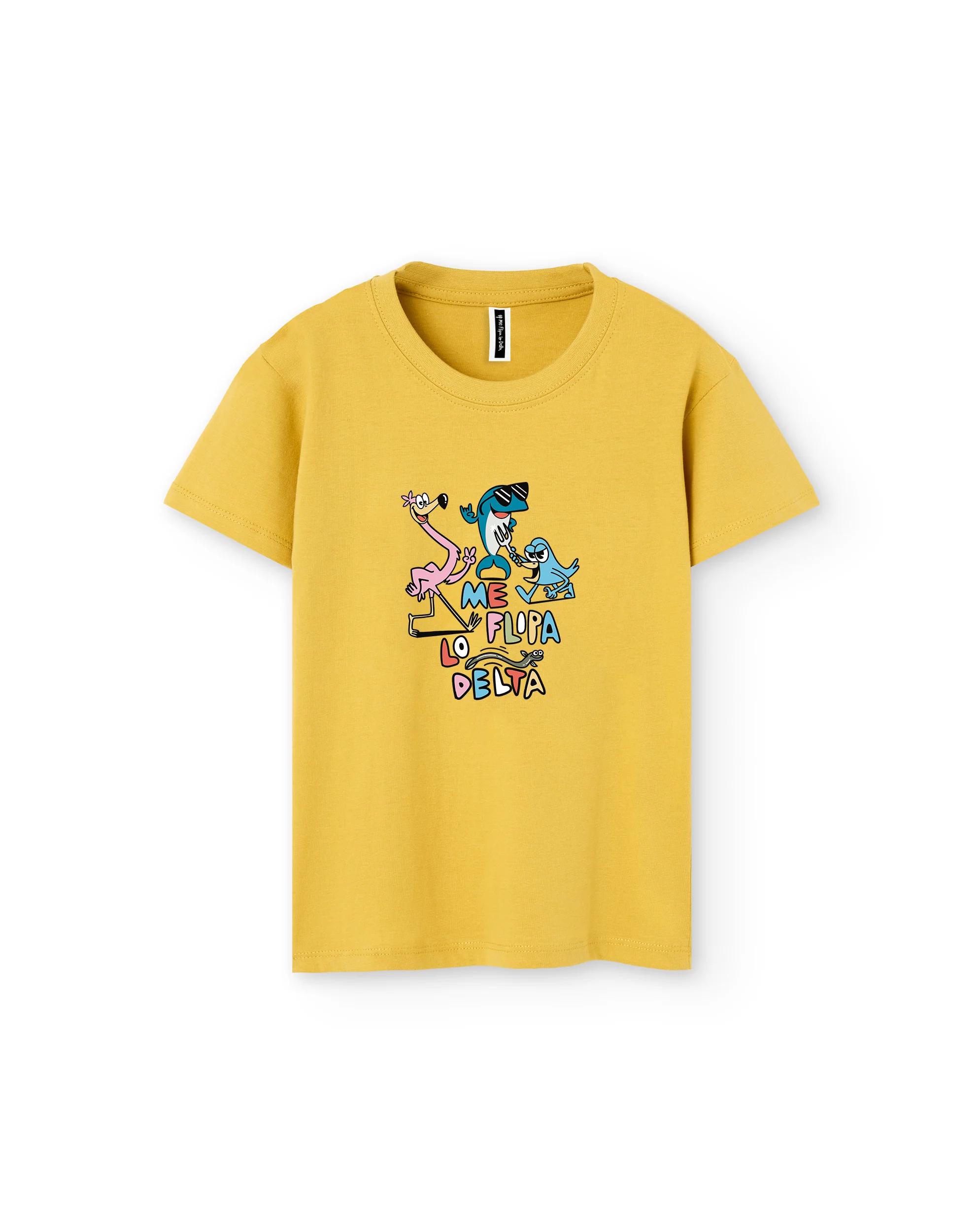 Camiseta de manga corta unisex Me Flipa lo Delta en color mostaza con estampado en pecho de fauna del Delta. Disponible en las tallas de 1 año a 10 años