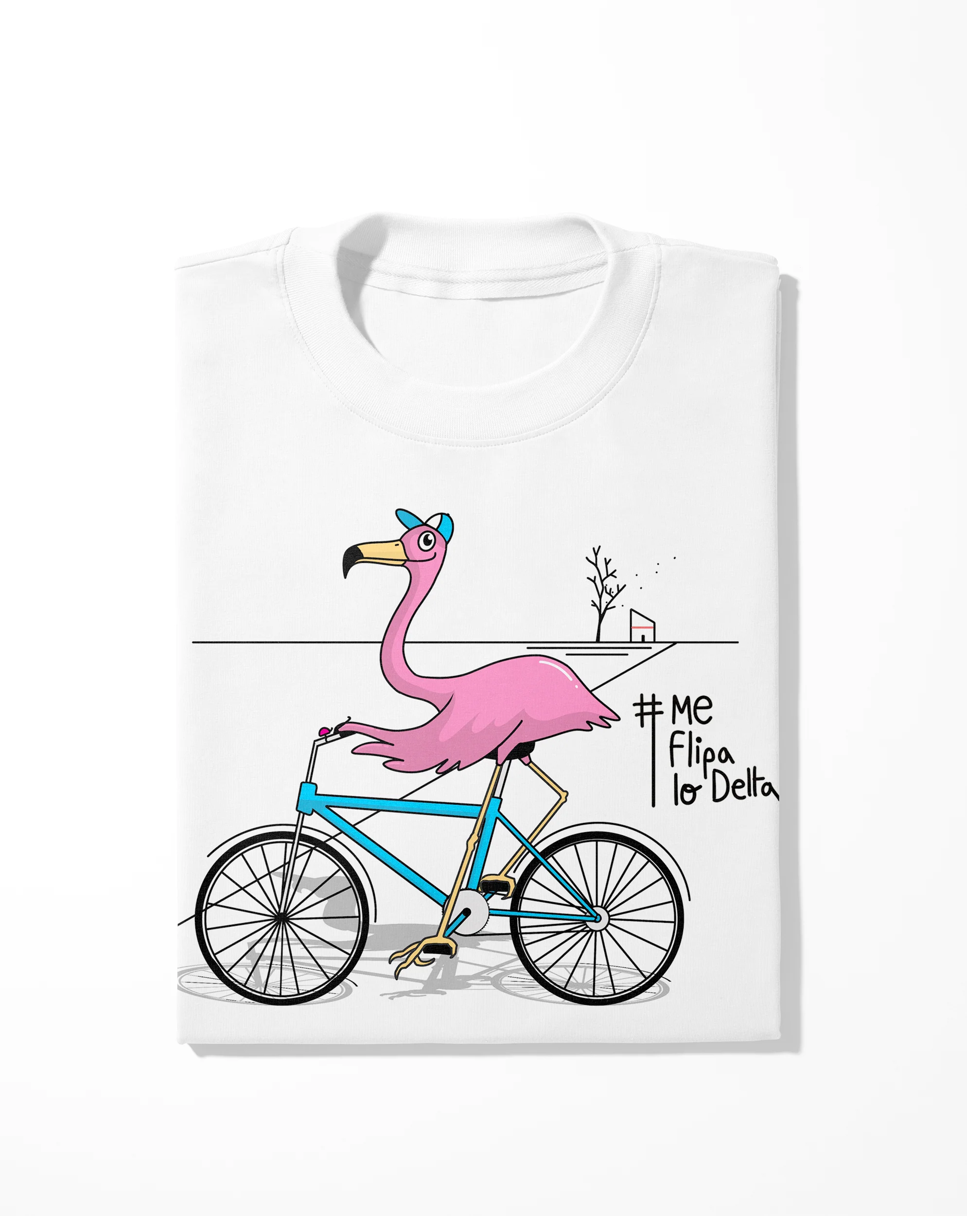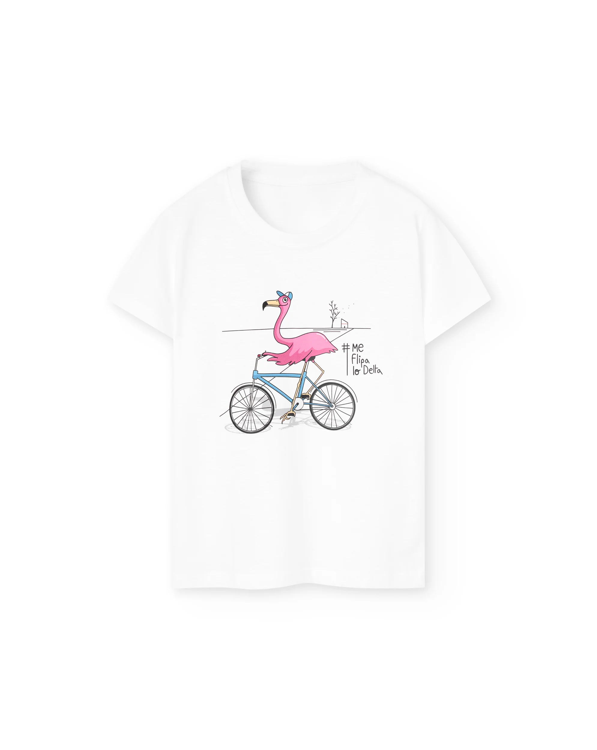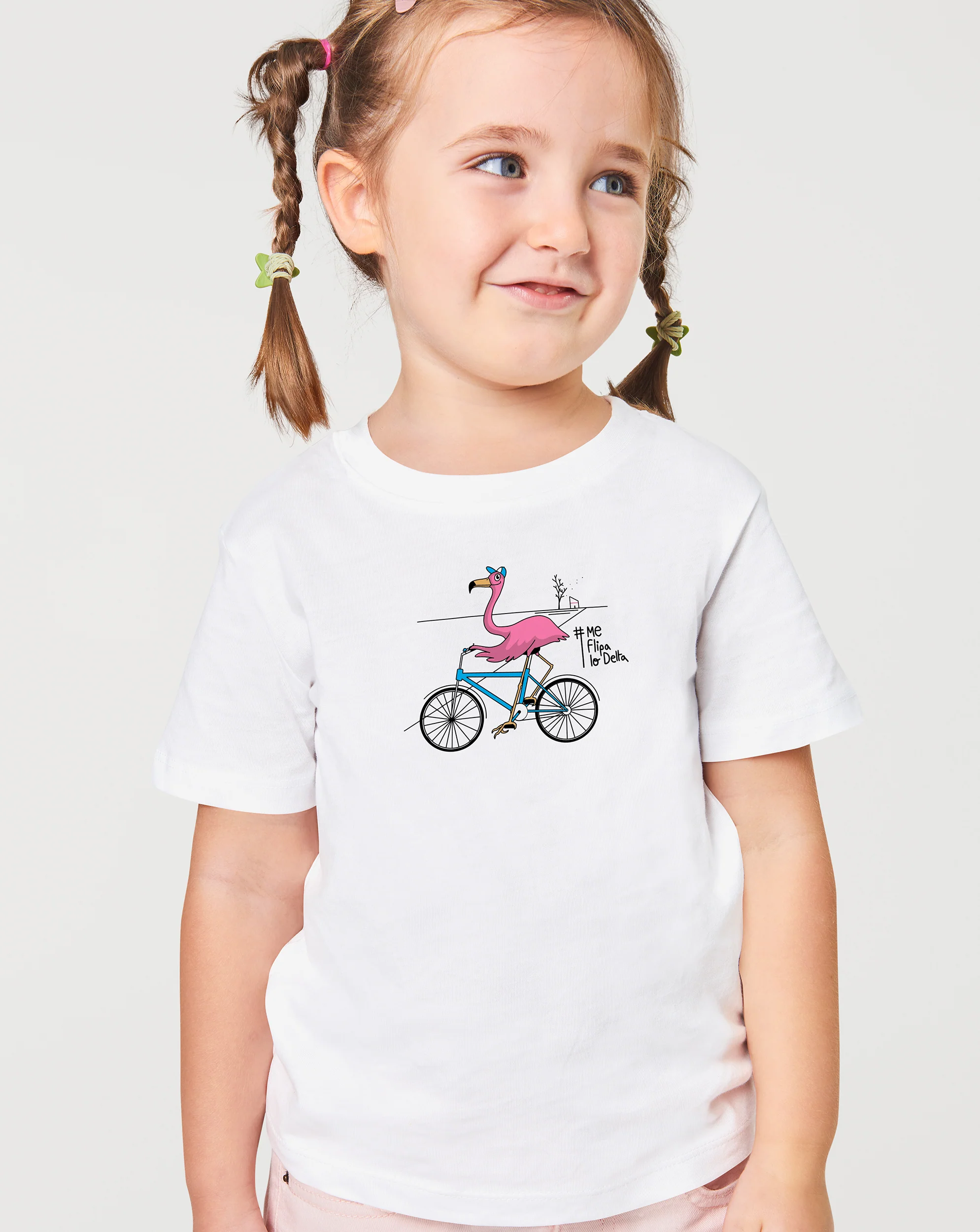 Camiseta de manga corta infantil de niño y niña Me Flipa lo Delta en color blanco con estampado en pecho de ave Martinet Blanc del Delta o Pátxera con cámara de fotos en mano. ¿ Si sale volando podría considerarse un dron ? Disponible en las tallas de 1 año a la 10 años