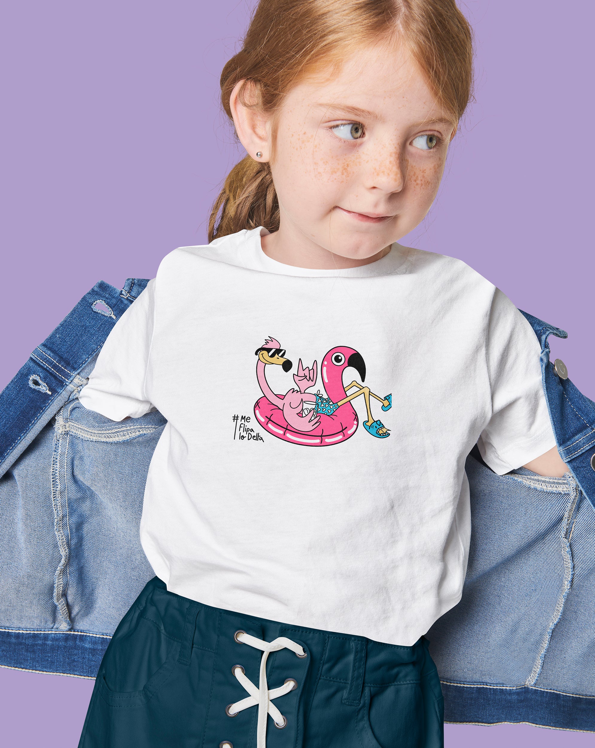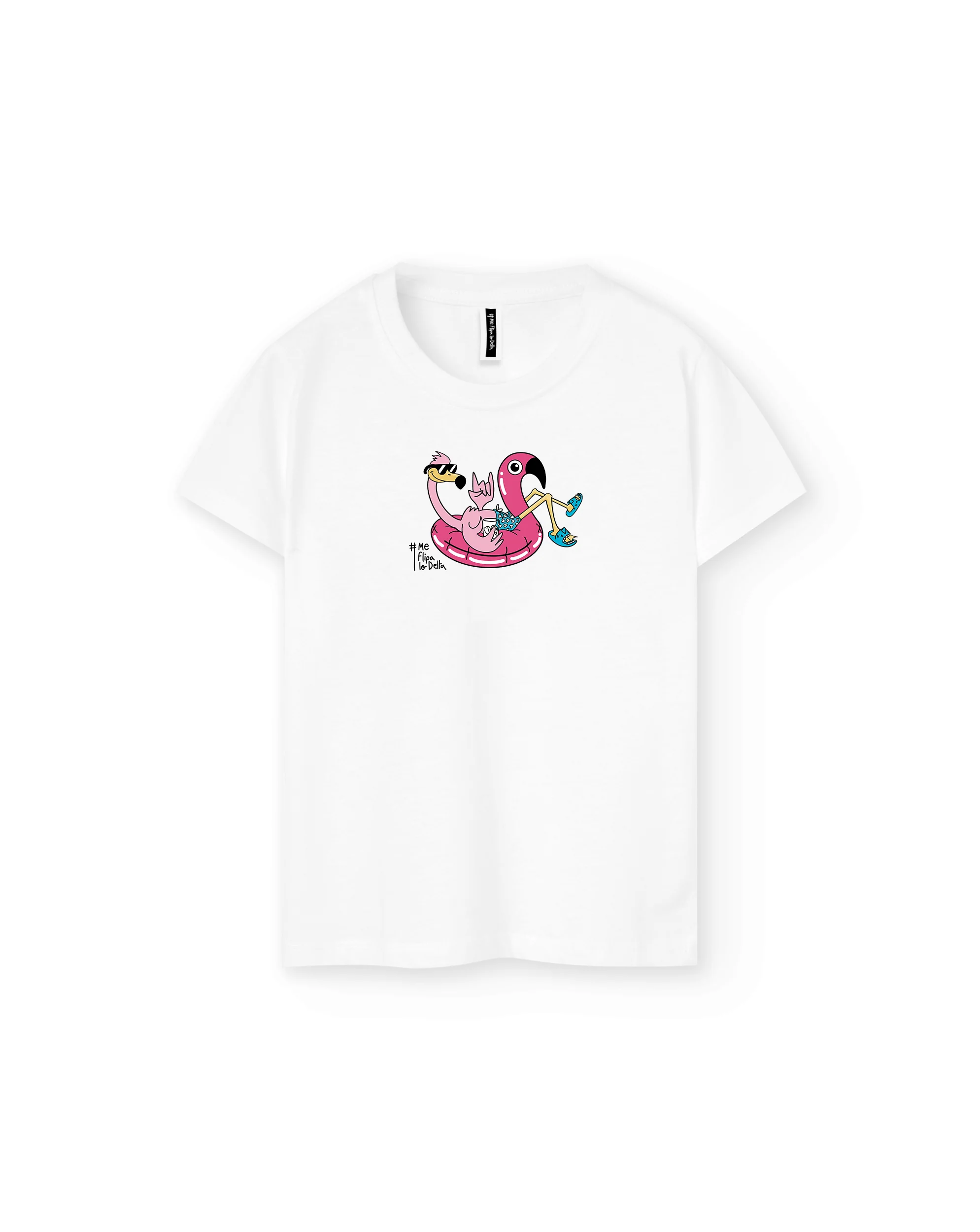 Camiseta de manga corta infantil de niño y niña Me Flipa lo Delta en color blanco con estampado en pecho flamenco en flotador. Disponible en las tallas de 1 año a la 10 años