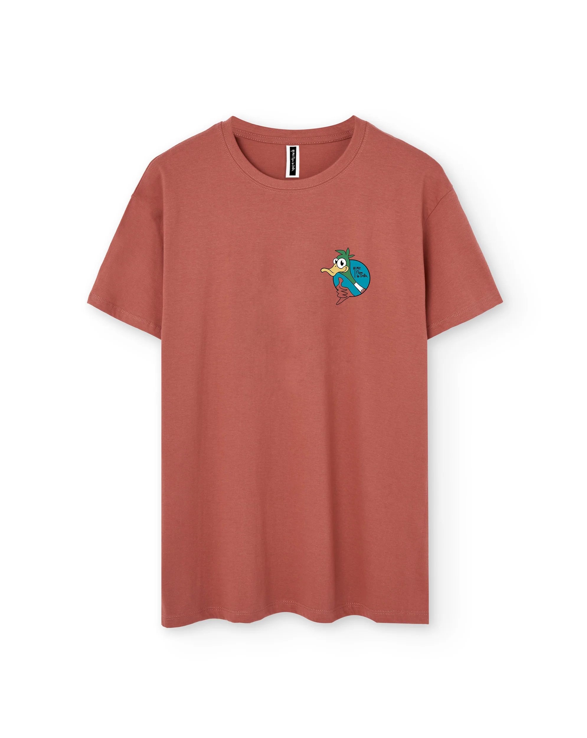 Camiseta de manga corta unisex Me Flipa lo Delta en color rojo teja con estampado en pecho de pato del Delta y pato molongui con iphone en la espalda. La que puede, puede. Disponible en las tallas de XS a la XXL