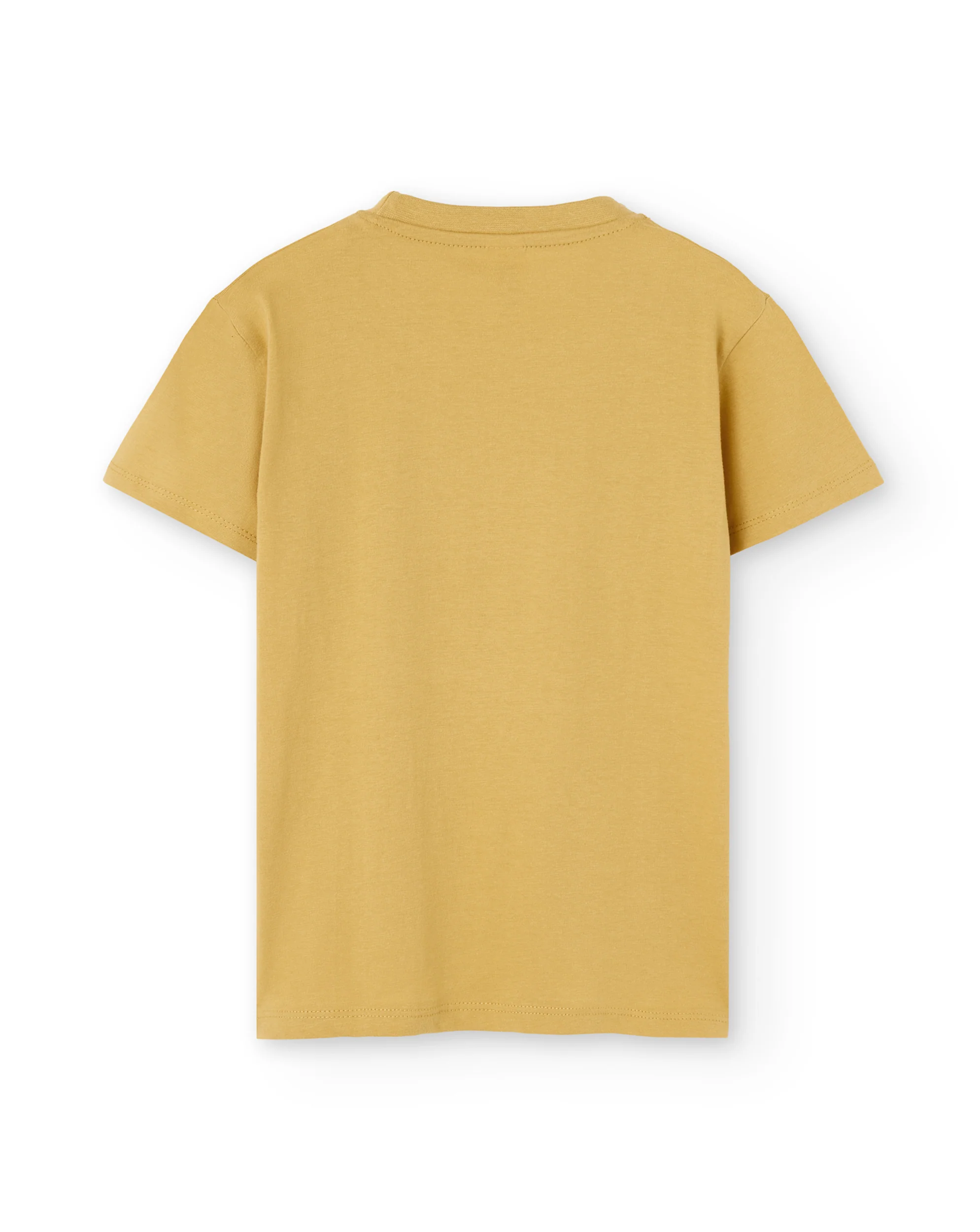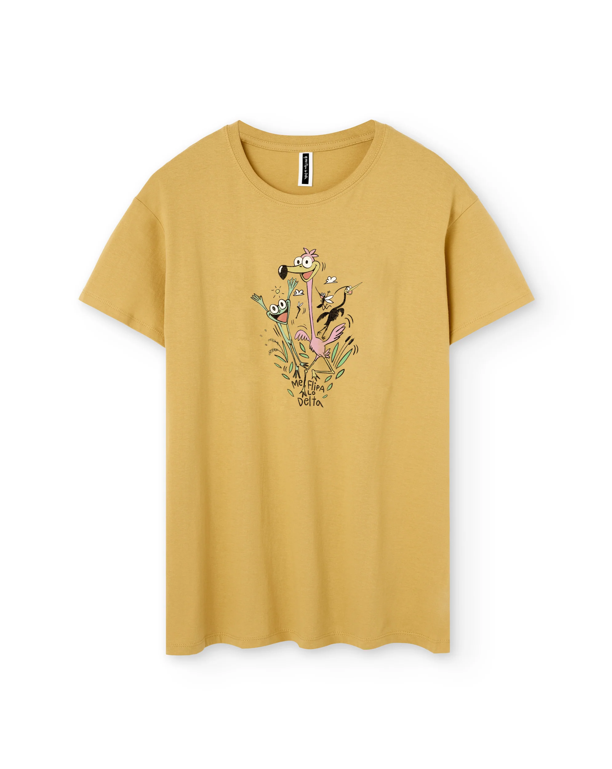 Camiseta de manga corta unisex Me Flipa lo Delta en color mostaza con estampado en pecho de animales del Delta del Ebro saltando. En el Delta nunca sabes de dónde te puede salir un animalito de un salto. Disponible en las tallas de S a la XXL