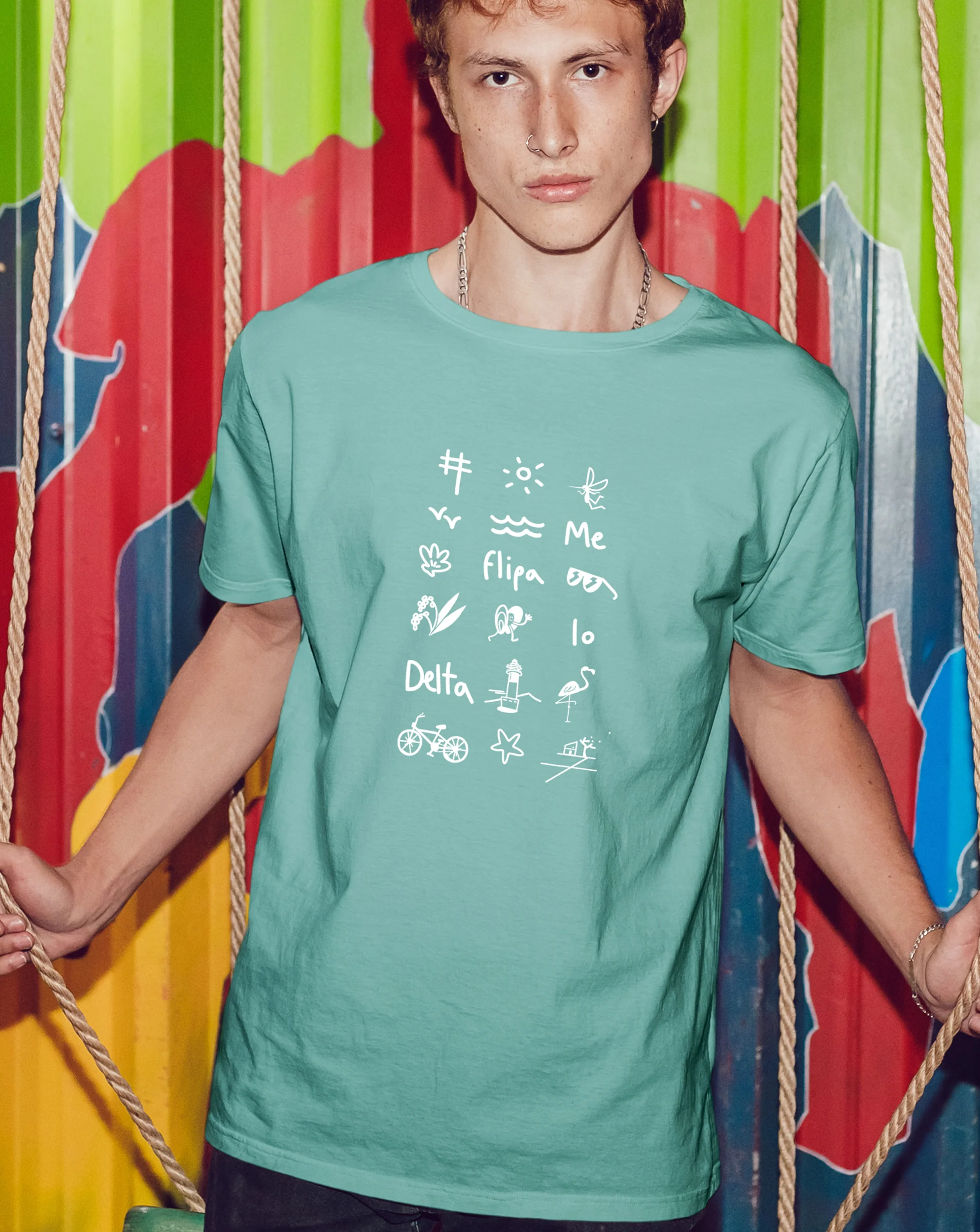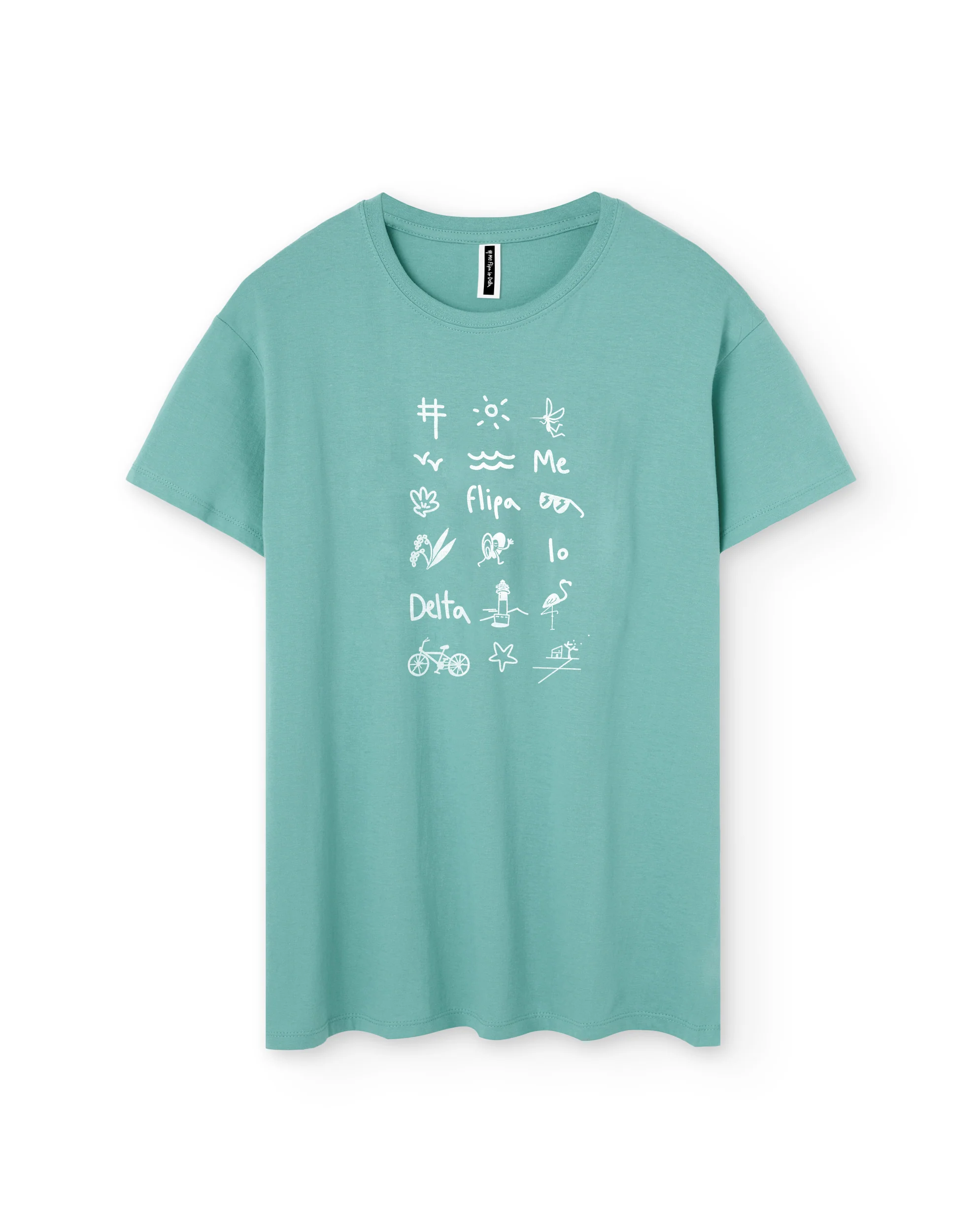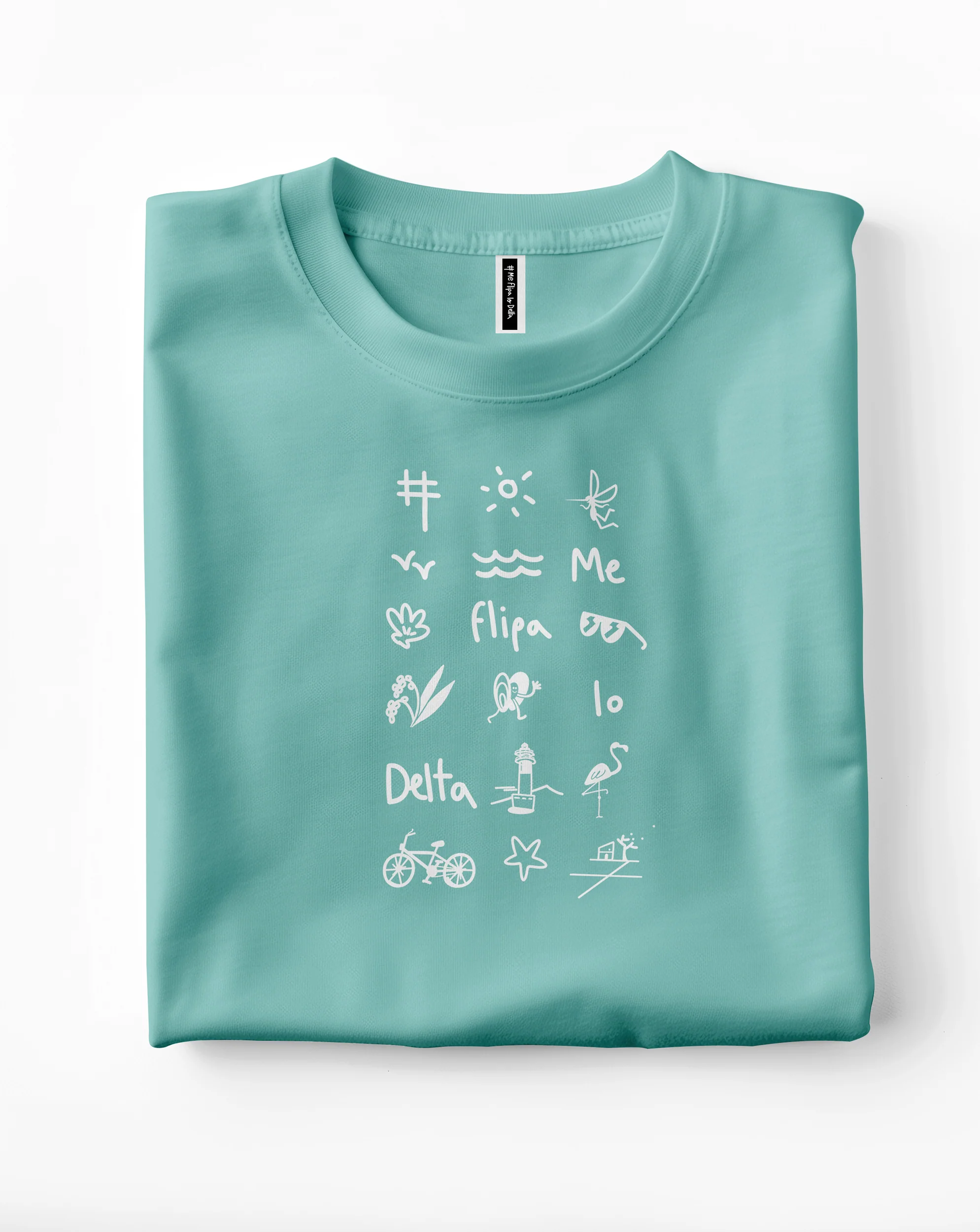 Camiseta de manga corta unisex Me Flipa lo Delta en color verde agua con estampado en pecho de iconos del Delta del Ebro. Un diseño más relajado para los amantes del delta del Ebro. Disponible en las tallas de S a la XXL